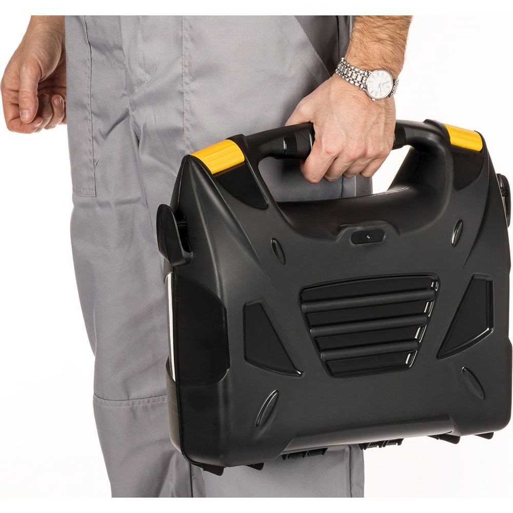 Кейс помогает содержать в порядке электроинструмент и аксессуары к нему, а также защищает его от пыли, грязи, повреждений. Кейс имеет универсальную форму для размещения большинства электроинструментов: дрели, болгарки, электролобзика, шуруповёрта. Идеален для использования дома, на даче, в гараже, мастерской, в автомобиле. За счёт зацепов на защёлках кейс легко открывается в перчатках. Благодаря эргономичной ручке комфортно переносить даже полностью заполненный тяжёлый кейс. На корпусе имеются отверстия для крепления наплечного ремня.