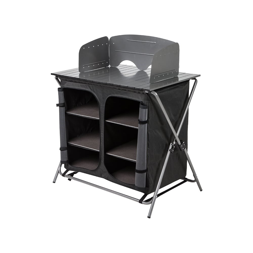 Кемпинговая кухня FHM Rest 000044-0003 используется на природе, в путешествиях и т.д. Каркас выполнен из стали, благодаря чему изделие прослужит долго. Специальная стенка защищает от ветра во время приготовления пищи. Кухня оснащена большим столом с алюминиевым покрытием, прочная и легко моется. Имеет полки для хранения различных продуктов. Дополнительные характеристики Ткань: 600D PVC Polyester Каркас: сталь Диаметр каркаса: 19 мм Материал столешницы: алюминий Максимальная нагрузка: 35 кг Размеры: 92х56х82/107(H) см Вес: 11 кг