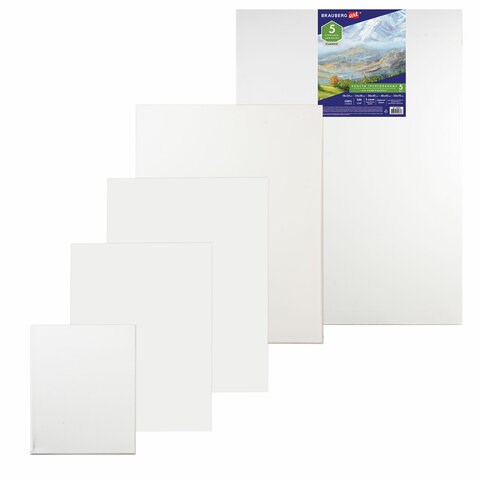 Холсты на подрамнике BRAUBERG ART CLASSIC, НАБОР 5 шт., грунтованные, 100% хлопок, среднее зерно, 190650