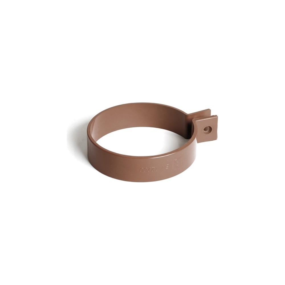 Изготовлен из первичного сырья, материал ПВХ, обеспечивает фиксацию водосточной трубы у фасада здания, также фиксирует поворотные и соединительные элементы трубы (соединитель трубы, колено).