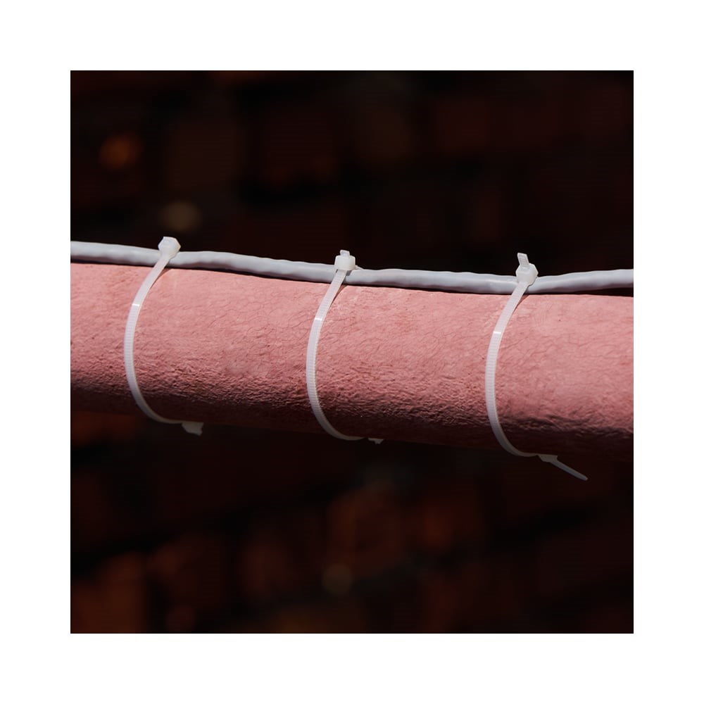 Нейлоновый хомут представляет собой экономичное и легкое крепежное изделие, используемое при проведении электромонтажных работ и организации кабельных систем. С его помощью выполняется фиксация проводов и труб, соединение их в жгут, маркировка и крепление к поверхностям. Стяжки изготовлены из высокопрочного нейлона- 6,6 (полиамида). Материал способен выдерживать большие нагрузки и не подвергается воздействию ультрафиолета, органических растворителей и горюче-смазочных материалов. Для монтажа устройства нужно вставить конец зубчатой ленты в замок и затянуть до образования петли необходимого диаметра. Также можно воспользоваться специальным монтажным инструментом (арт. 12-4524, 12-4521 и 12-4541). В упаковке поставляются 25 белых стяжек размером 100x2,5 мм.
