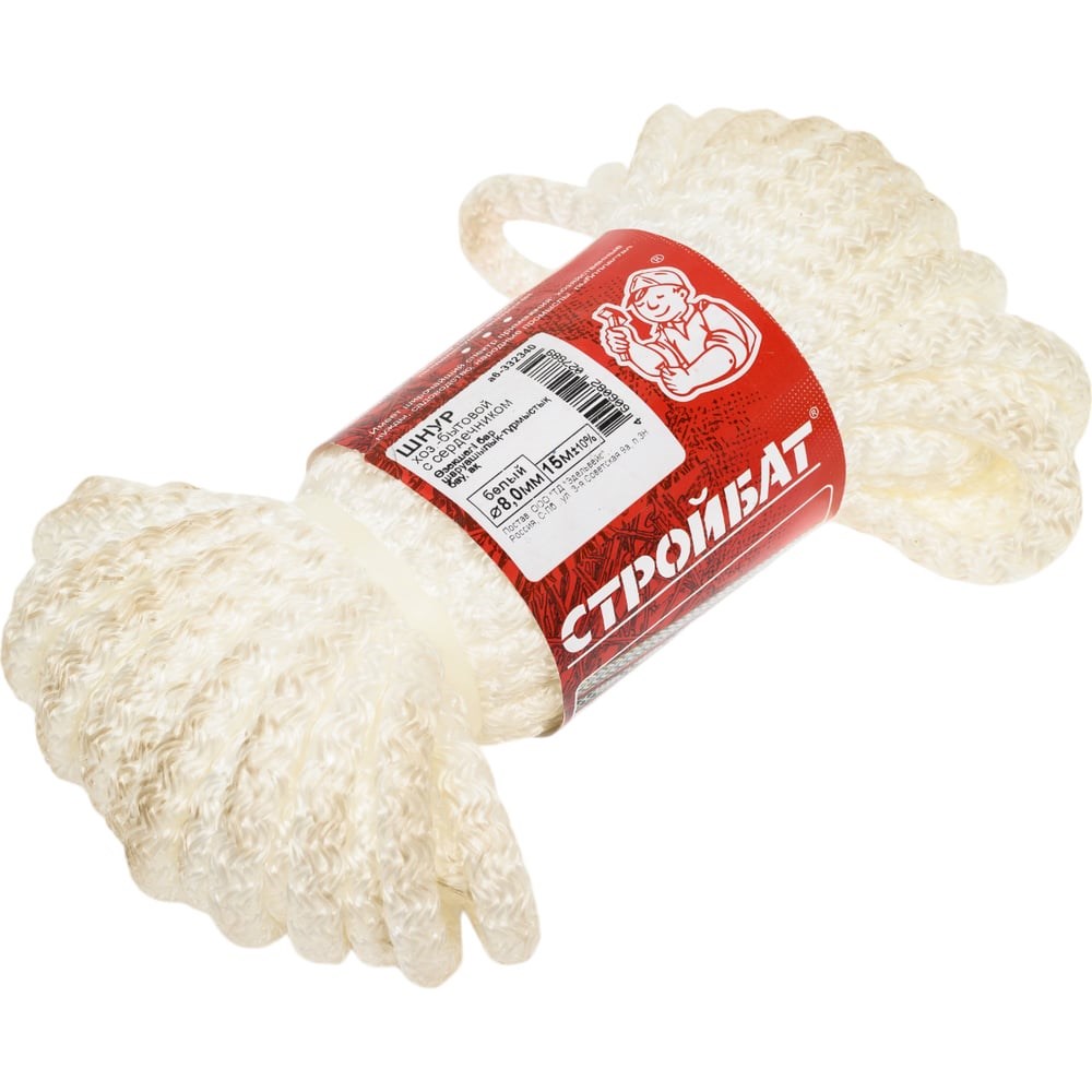 Шнур Стройбат хозяйственно-бытовой с сердечником 8 мм белый 15 м 332340 выполнен из пленочных нитей. Имеет высокую устойчивость к растяжению. Материал легко выдерживает большие нагрузки и резкие перепады температуры. Подходит для использования в помещении и на улице. Всесезонное универсальное изделие.