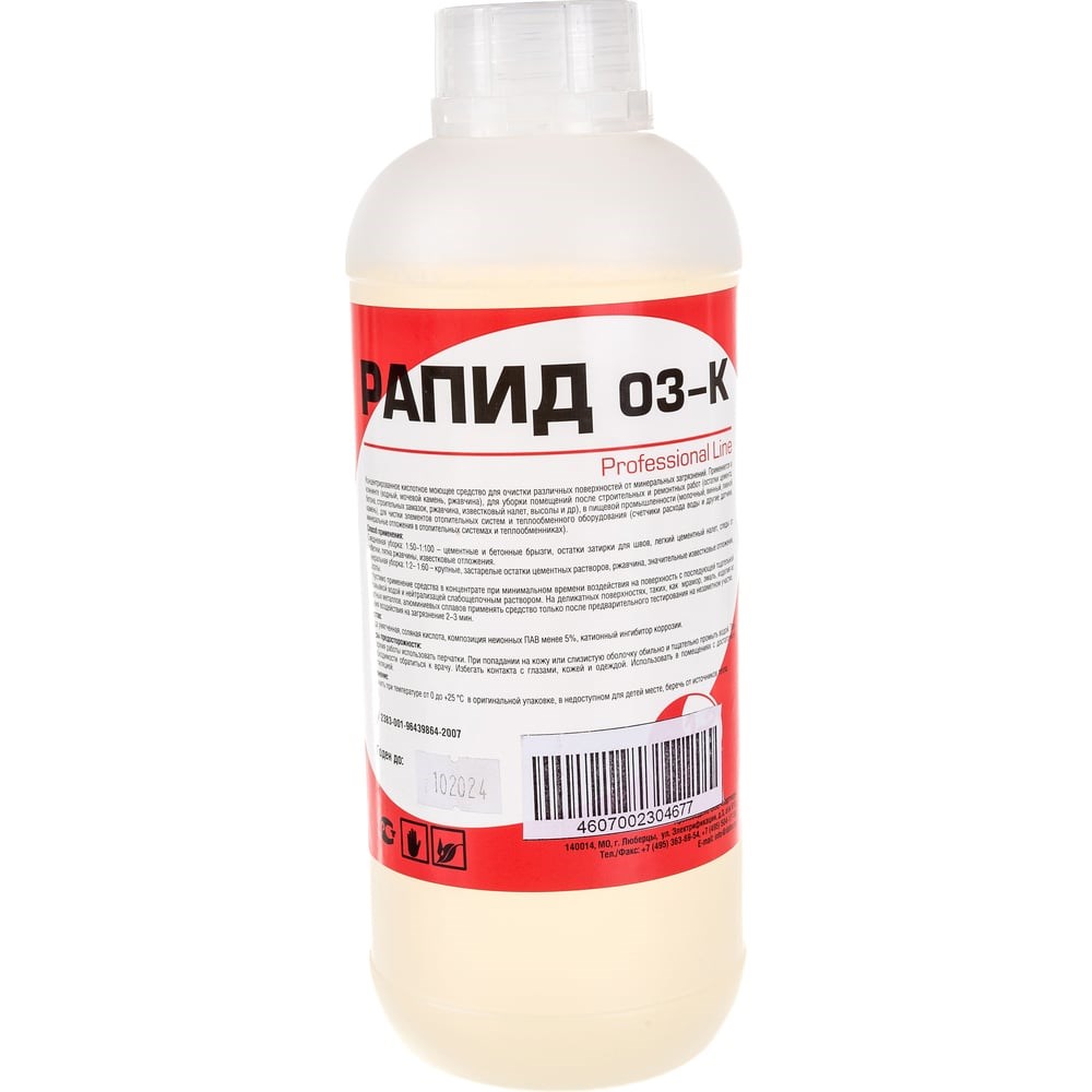 Рапид 03-K - кислотное средство для очистки поверхностей от ржавчины, известкового налета, водного, мочевого, пивного камня. Может применяться для уборки помещений после установки сантехнического оборудования, строительных и ремонтных работ (остатки цемента, бетона, строительных замазок).Способ примененияЕжедневная уборка: 1:50-1:100Генеральная уборка: 1:2– 1:60