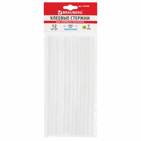 Клеевые стержни, диаметр 7 мм, длина 200 мм, прозрачные, комплект 12 шт., BRAUBERG, европодвес, 670292