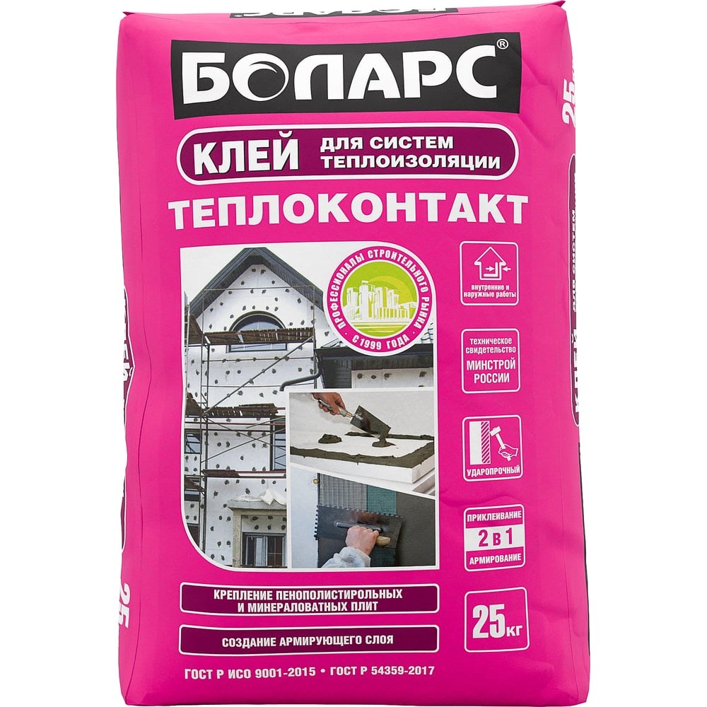 Клей БОЛАРС Теплоконтакт 25 кг 00000003734 применяется для крепления пенополистирольных и минераловатных плит к минеральным основаниям (кирпичные, каменные, бетонные и газобетонные поверхности) и устройства на них базового штукатурного слоя, армированного стеклотканевой сеткой. Состав обладает повышенной трещиностойкостью, высокой адгезией. Препятствует проникновению влаги к поверхности утеплителя, обеспечивая высокую паропроницаемость. Изготовлен на цементно-песчаной основе, с использованием высокоэффективных полимерных и модифицирующих добавок. Предназначен для нанесения ручным способом при наружных и внутренних работах.