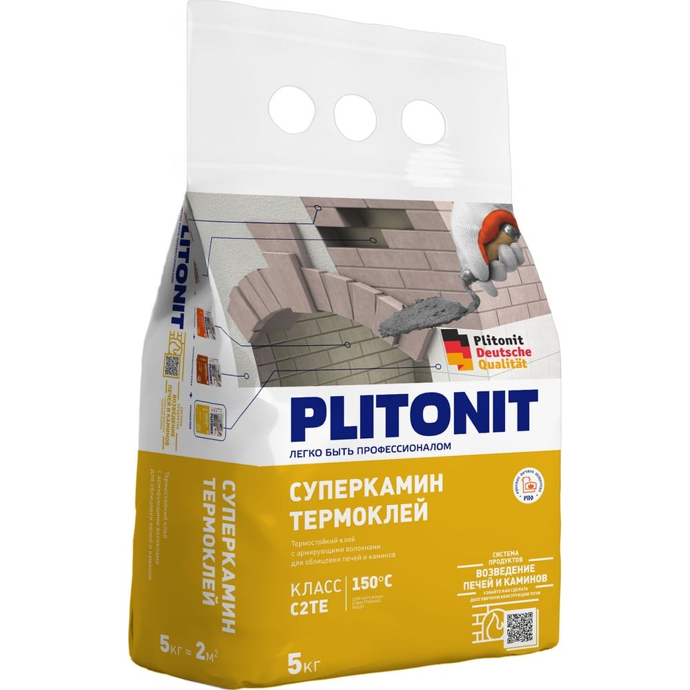Клей для облицовки печей и каминов PLITONIT СуперКамин ТермоКлей 5 кг 7499 - термостойкий клей с армирующими волокнами для облицовки печей и каминов С2 ТЕ, ГОСТ Р 56387. Предназначен для приклеивания облицовочной плитки из керамики, керамогранита, натурального и искусственного камня при отделке кирпичных поверхностей печей, каминов и бетонных оснований, подверженных температурному воздействию внутри и снаружи помещений.