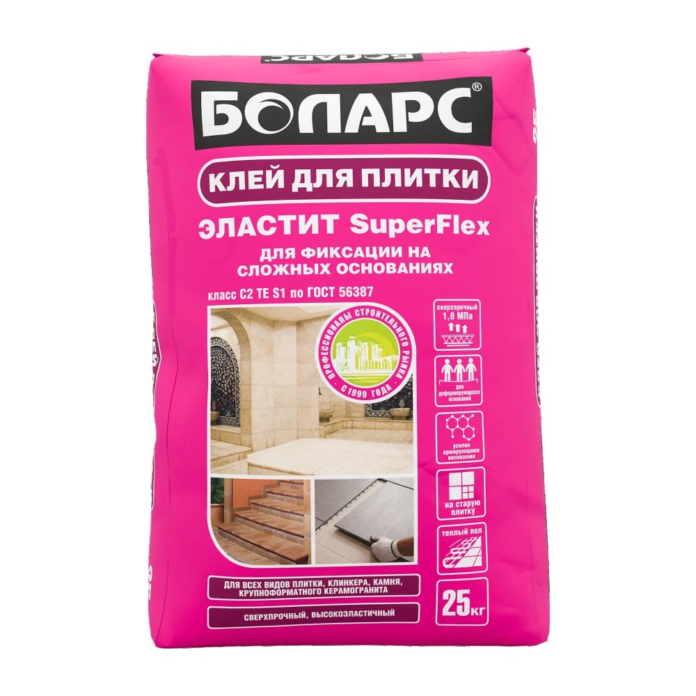 Клей для плитки БОЛАРС ЭЛАСТИТ SUPER FLEX 25 кг, класс C2TES1 00000038369 - высокоэластичный, сверхпрочный, стойкий к сползанию клей для надежного крепления всех видов керамической плитки, клинкера, а также керамогранита, мрамора, натурального и искусственного камня. Обеспечивает максимальную прочность сцепления с основаниями, в том числе, деформирующимися, а также с основаниями, подверженными вибрациям. Применяется по основаниям, подверженным температурным колебаниям (террасы, балконы, полы с подогревом) и повышенным эксплуатационным нагрузкам (торговые центры, промышленные цеха, склады). Надежен при эксплуатации в условиях постоянного и периодического контакта с водой: для облицовки чаш бассейнов, фонтанов, ванных комнат, душевых, бань, саун, подвалов, фасадов, цоколя. Подходит для приклеивания плитки на старую плитку. Рекомендован для облицовки лестниц. Используют по основаниям: бетон (пено-, газо-, шлакобетон, газосиликат), цементные основания (цементная и цементно-известковая штукатурка и шпатлевка, стяжка, наливной пол), гипсовые основания (штукатурка, ПГП, наливной пол), кирпич, ГКЛ, ГВЛ, ЦСП, OSB. Изготовлен на основе высококачественного цемента, фракционированного песка, высокоэффективных модифицирующих добавок и полимеров.