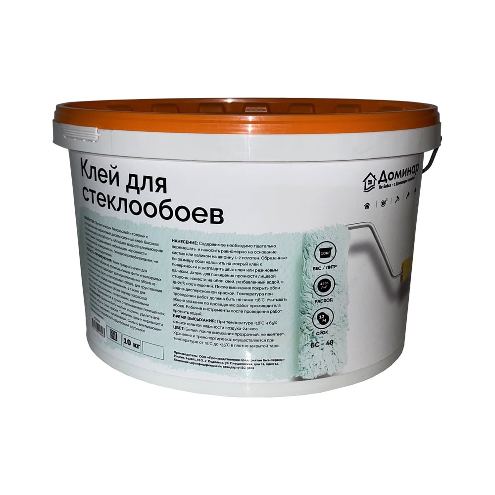 Клей для стеклообоев Доминар БС 48 10 кг A57059 - экологически безопасный и готовый к употреблению акриловый дисперсионный клей. Высокая склеивающая способность, обладает водоотталкивающими свойствами, выравнивает небольшие неровности оклеиваемой поверхности, пожаровзрывобезопасен, не содержит растворителей. Клей предназначен для приклеивания обоев из стекловолокна, фото и велюровых обоев, для грунтования поверхностей перед наклеиванием, а также для грунтования наклеенных обоев перед покраской водно-дисперсионными, латексными, акриловыми красками. Применяется в сухих отапливаемых помещениях.