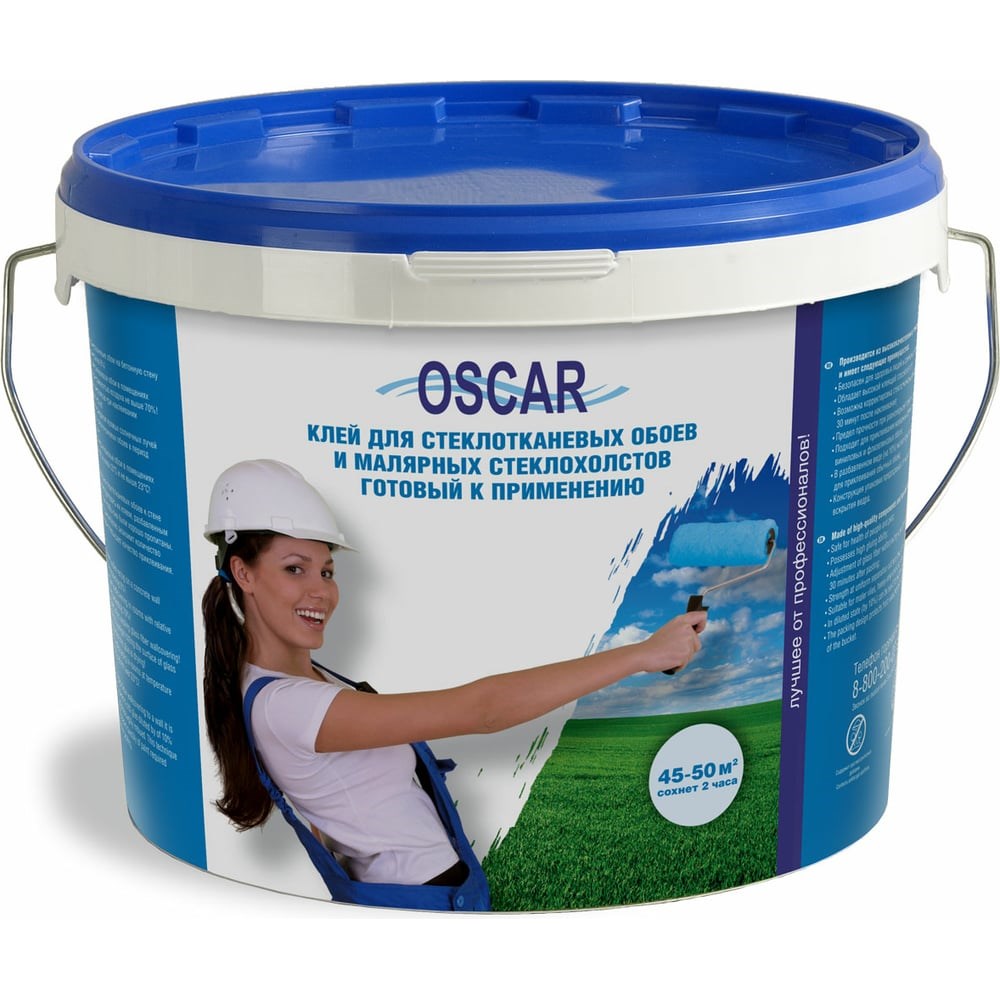 Клей для стеклотканевых обоев и малярных стеклохолстовOscarготовый к применению – специализированный клей на латексной основе для приклеивания стеклотканевых обоев (стеклообоев), малярных стеклохолстов, а также всех видов тяжелых обоев, текстильных и виниловых обоев на бумажной и флизелиновой основе, джутовых тканей и пр. на стены и потолки внутри помещений.Свойства:водорастворимый;обладает исключительно высоким начальным и конечным сцеплением;допускает корректировку наклеиваемого материала в течение 20-30 минут;подходит для помещений с повышенной влажностью;морозостойкий, выдерживает многократное замораживание;сохраняет паро- и воздухопроницаемость поверхностей;наносится ручным малярным инструментом и механизированным способом;содержит противоплесневые, противогрибковые и антибактериальные добавки;срок годности – 3 года;время высыхания – 24 часа;расход – до220 г/м2 в зависимости от температурно-влажностных условий проведения работ, фактурности оклеиваемой поверхности и способа использования;Способ применения:Клей наносится ручным или механизированным способом толстым слоем («клеевая шуба» 0,5-1 мм). Клей можно наносить малярными кистями (в труднодоступных местах), малярным валиком для водных ЛКМ с нитяным ворсом (длина ворса – 8-12 мм) и аппаратом безвоздушного распыления.