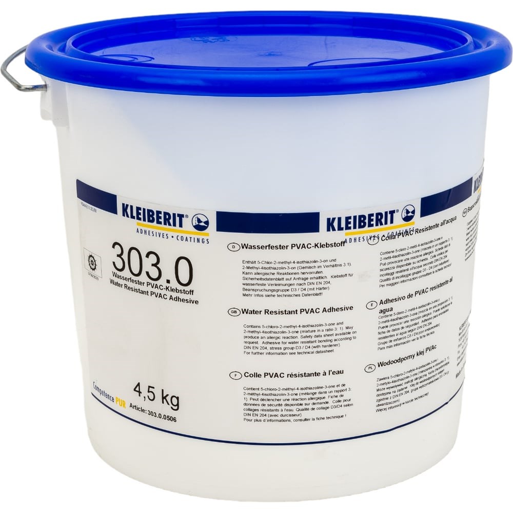 Клей в ведре Клейберит 303.0 4.5 KLB0002/4.5 предназначен для водостойких соединений, используется в производстве мебели, проведении отделки, склеивание в судостроении. Клей легко наносится шпателем, кистью или клеенаносящим валиком. Технические характеристики: Класс водостойкости: D3/D4 (с отвердителем) Плотность: 1.10 г/куб.см Время открытой выдержки при 20°С: 6 - 10 минут Точка беления: +5°С Сертифицированное количество нанесения: 150 г/кв.м