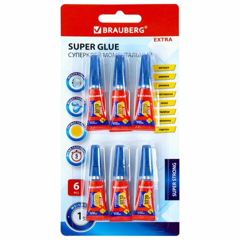 Клей моментальный суперклей экономичный BRAUBERG EXTRA, 1 г суперпрочный, КОМПЛЕКТ 6 ШТ., 608109