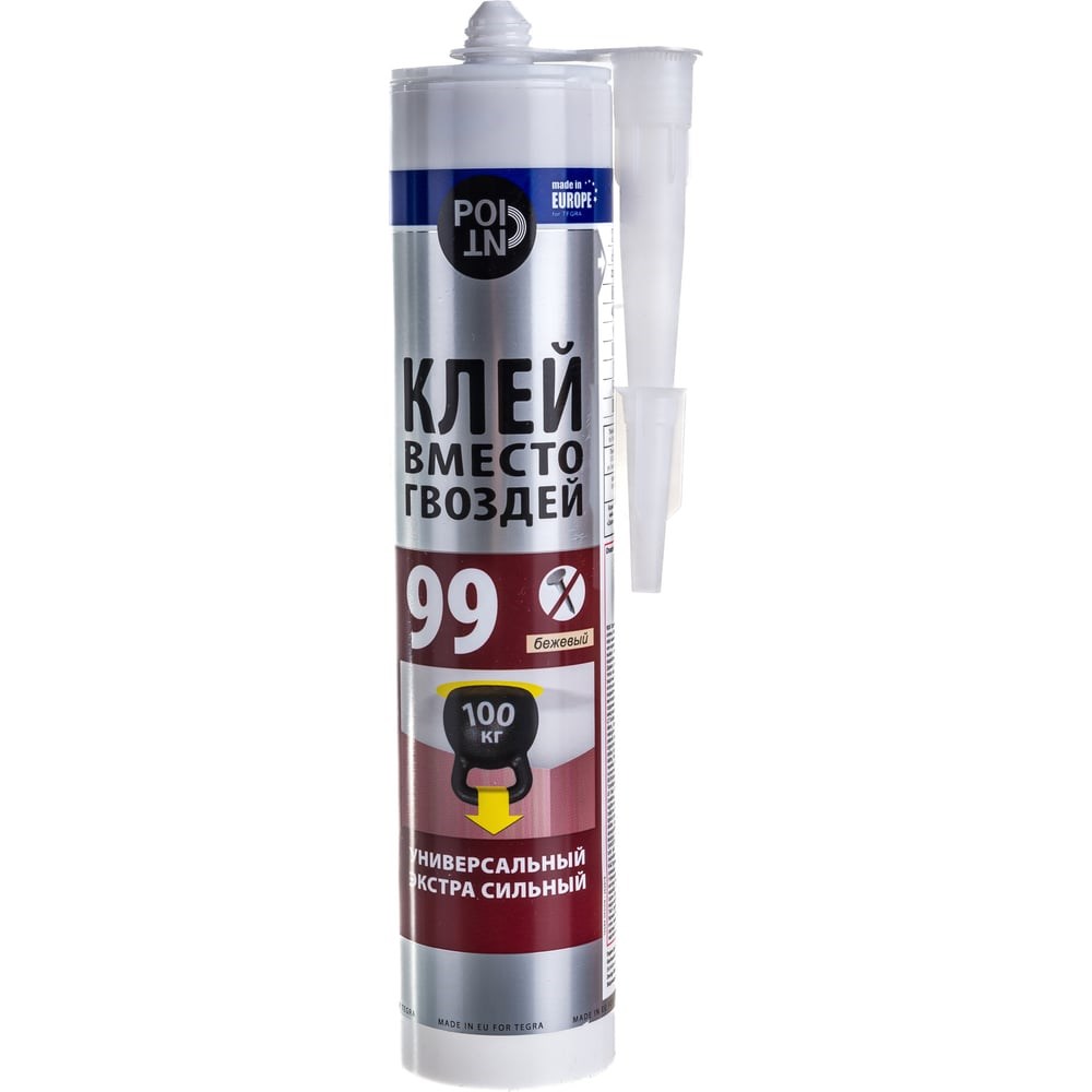 Клей вместо гвоздей POINT 99, экстра сильный, 280 мл 03-1-0-099 используют во время монтажных и отделочных работ для приклеивания планок, панелей, кессонов, розеток, карнизов, термических и акустических изоляционных материалов. Состав обеспечивает высокую липкость к большинству строительных оснований: бетон, кирпич, штукатурка, гипс, камень, древесина, металл, керамическая плитка, гипсокартон. Продукт применяют внутри и снаружи помещений при температуре от +10ºC до +30ºC. Эластичный клеевой шов обладает влагоотталкивающими свойствами, быстрым первоначальным схватыванием, не сползает при вертикальном нанесении и обеспечивает надежную фиксацию элементов.
