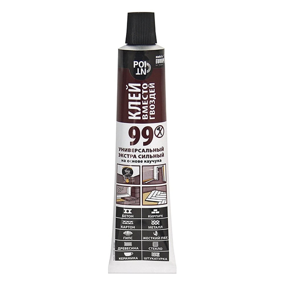 Клей вместо гвоздей POINT 99 экстрасильный туба 80 мл 03-1-0-199 используют во время монтажных и отделочных работ для приклеивания планок, панелей, кессонов, розеток, карнизов, термических и акустических изоляционных материалов. Состав обеспечивает высокую липкость к большинству строительных оснований: бетон, кирпич, штукатурка, гипс, камень, древесина, металл, керамическая плитка, гипсокартон. Продукт применяют внутри и снаружи помещений при температуре от +10ºC до +30ºC. Эластичный клеевой шов обладает влагоотталкивающими свойствами, быстрым первоначальным схватыванием, не сползает при вертикальном нанесении и обеспечивает надежную фиксацию элементов.