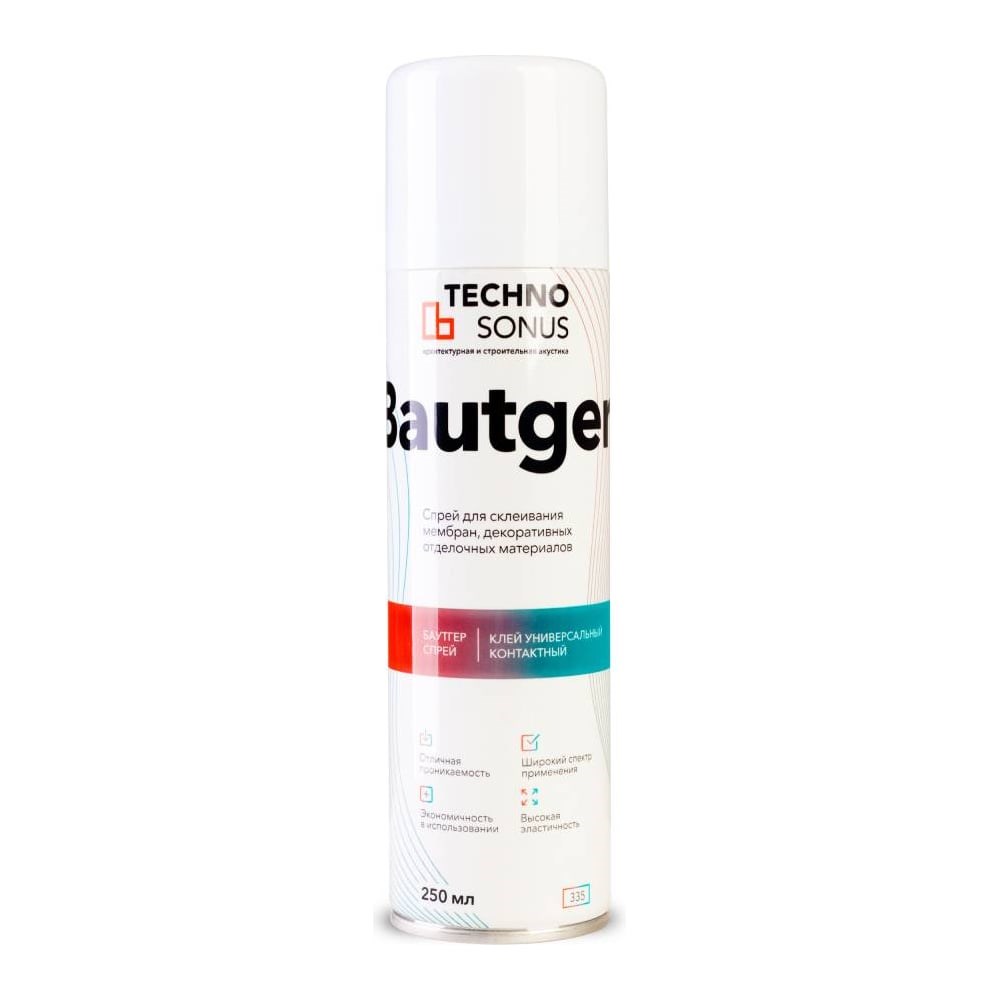 Клей ТехноСонус Баутгер аэрозольная упаковка 250 мл 1400200004 благодаря отличной адгезии практически ко всем поверхностям, предназначен для надежного склеивания материалов: с пористой структурой (поролон, минеральная вата, войлок), декоративных отделочных материалов, плотных тяжелых материалов, таких как звукоизоляционные мембраны. Аэрозольная форма выпуска обеспечивает удобство нанесения клея ровным тонким слоем. Состав: органические растворители; SBS- полимер; смолы; модифицирующие добавки.