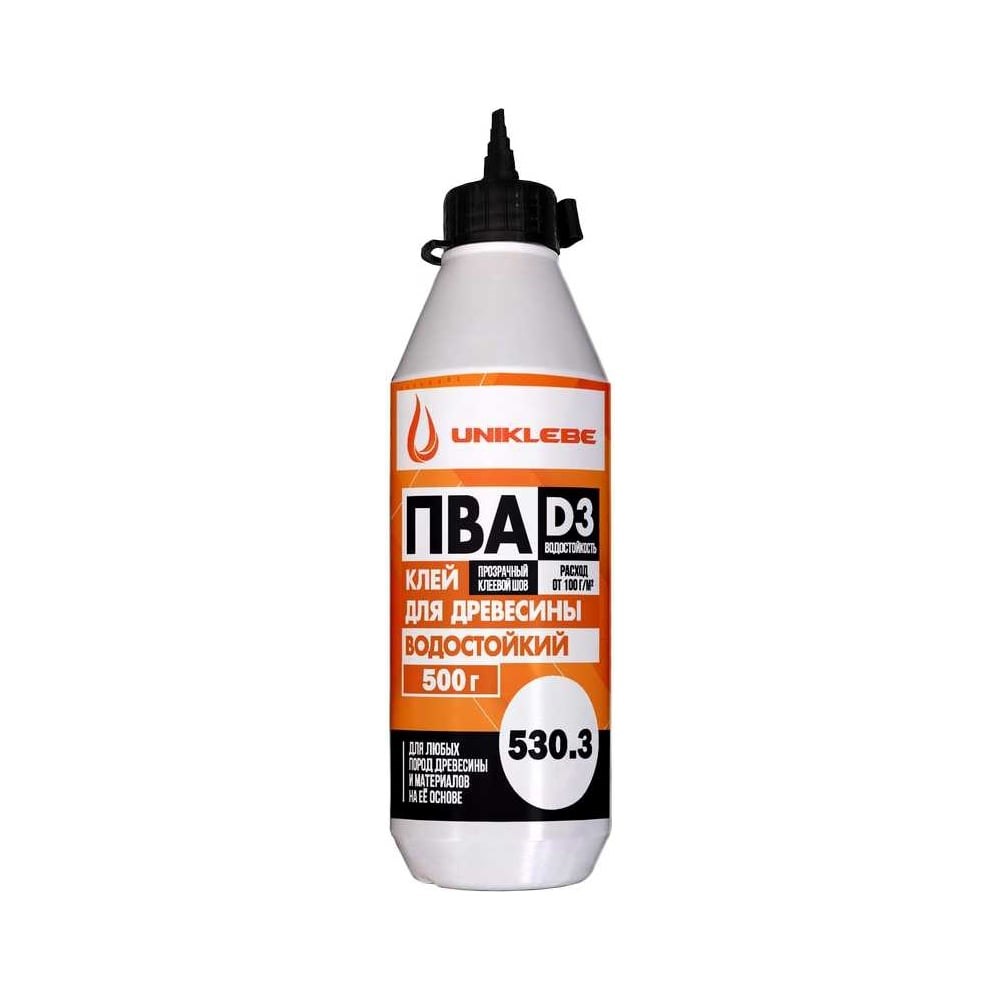 UNIKLEBE 530.3 - поливинилацетатный водостойкий клей класса водостойкости D3 для склеивания древесины и материалов на ее основе. Применяется для любых бытовых и профессиональных столярных работ: производство клееного бруса, мебельного щита, дверных, оконных блоков, стеновых панелей, плит и других конструкций, а также для паркетных работ. Клей обладает высокой скоростью начального схватывания, высокой склеивающей способностью, морозостойкостью и водостойкостью клеевого шва. Время открытой выдержки при температуре +20 градусов составляет 5-15 минут. Используется как однокомпонентный. Удовлетворяет требованиям ТУ 5770-001-09285659-2015. Расход: 100-130 г/кв. м при приклеивании по пласти; 150-200 г/кв. м при склеивании массивной древесины.