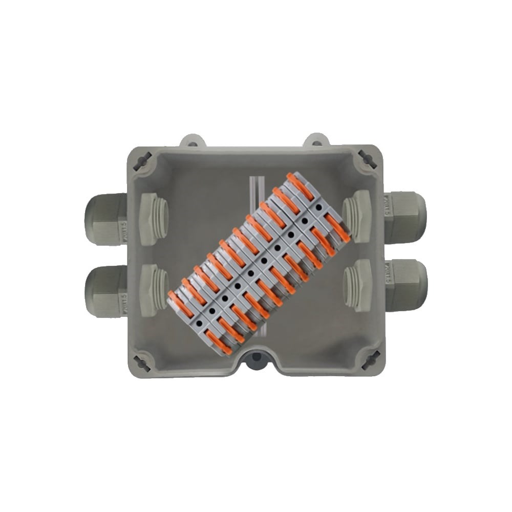 Влагозащищенная коробка распределительная клеммная КСП-10 АЯКС (IP66) с рычажковыми клеммами предназначена для монтажа, коммутации электрических и кабельных линий, сигнальных шлейфов сигнализации, цепей питания.Отличительной особенностью коробки является высокая степень защиты от пыли и влаги и возможность установки в ней различных кабельных вводов для подключения всех существующих видов кабельной прокладки, шин заземления, клапана выравнивания давления, комплектация двухкомпонентным компаундом.Коробка конструктивно состоит из основания, внутри которого расположены проходные клеммники. Основание коробки закрывается герметичной крышкой и фиксируется винтами. Корпус коробки оборудован герметичными кабельными вводами. Монтаж коробки производится по соответствующей нормативно-технической документации на монтаж, испытания и сдачу в эксплуатацию кабельных линий.Основание коробки крепится к поверхности с помощью саморезов. Провода, присоединяемые к контактам коробки должны быть обесточены.В процессе эксплуатации коробка не требует технического обслуживания.