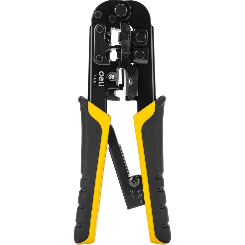 Обжимные клещи DELI DL4971 4P, 6P, 8P 98342 подходят для профессионального использования. Клещи изготовлены из холоднокатаного стального листа углеродистой стали с чёрной отделкой. Материал обладает высокой прочностью и долговечностью. Благодаря двухкомпонентной ручке с храповым механизмом уменьшается усталость при работе с инструментом. Подходит для витой пары UTP / STP и телефонных кабелей, 4P, 6P , 8P.
