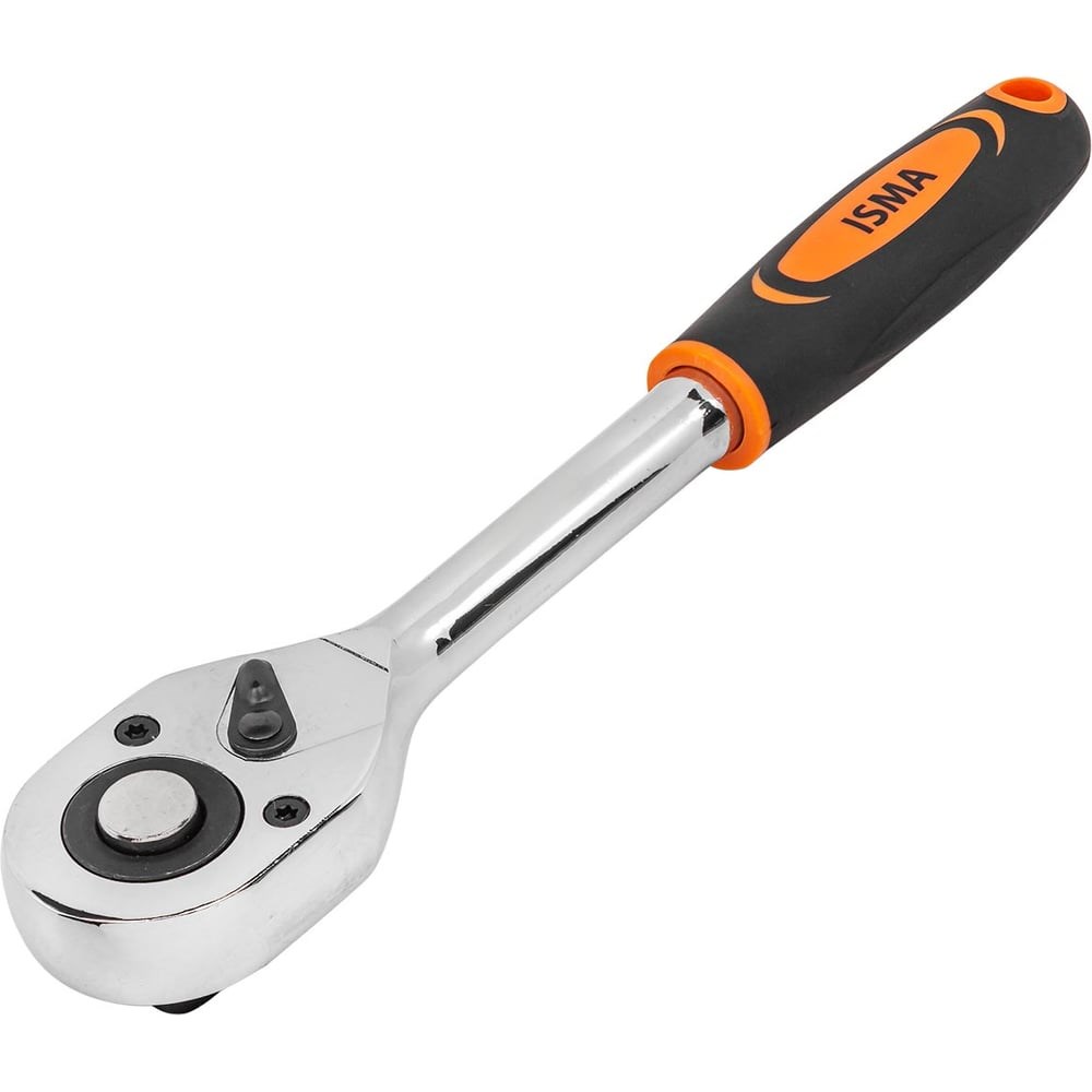 Ключ трещотка от бренда ISMA — это надежный инструмент, который станет отличным помощником в работе как профессионалов, так и домашних мастеров. С посадочным квадратом 1/2 дюйма и 24-м зубчатым механизмом, он идеально подходит для использования со стандартными торцевыми головками, насадками, удлинителями и переходниками однотипных посадочных размеров, а также стандартными шестигранными битами.Основные характеристики:Посадочный квадрат: 1/2 дюйма, совместим с большинством стандартных аксессуаров.Зубчатый механизм: 24 зуба, обеспечивающий плавное и надежное вращение.Направление вращения: Возможность вращения в обе стороны для удобства завинчивания и вывинчивания крепежных изделий, с флажком переключения направления.Компактный размер: Малые размеры позволяют работать в труднодоступных местах, что делает инструмент универсальным.Эргономичная ручка: Резиновая ручка обеспечивает комфорт при использовании и обладает антискользящими свойствами, что снижает усталость при длительной работе.Прочность и долговечность: Корпус трещотки изготовлен из хромомолибденовой инструментальной стали методом горячей штамповки с последующей закалкой, что обеспечивает высокую прочность и защиту от коррозии благодаря химическому оксидированию.Ключ трещотка ISMA — это качественный инструмент, который обеспечивает удобство и эффективность при выполнении различных задач, делая его отличным выбором для любых ремонтных работ.