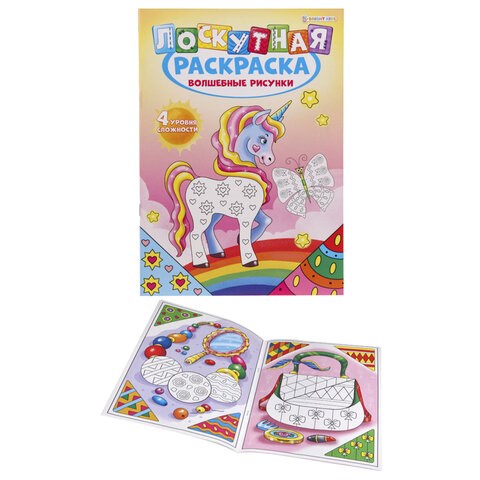 Книжка-раскраска ЛОСКУТНАЯ, ВОЛШЕБНЫЕ РИСУНКИ, А4, 16 страниц, цветной внутренний блок, BK, Р-6523