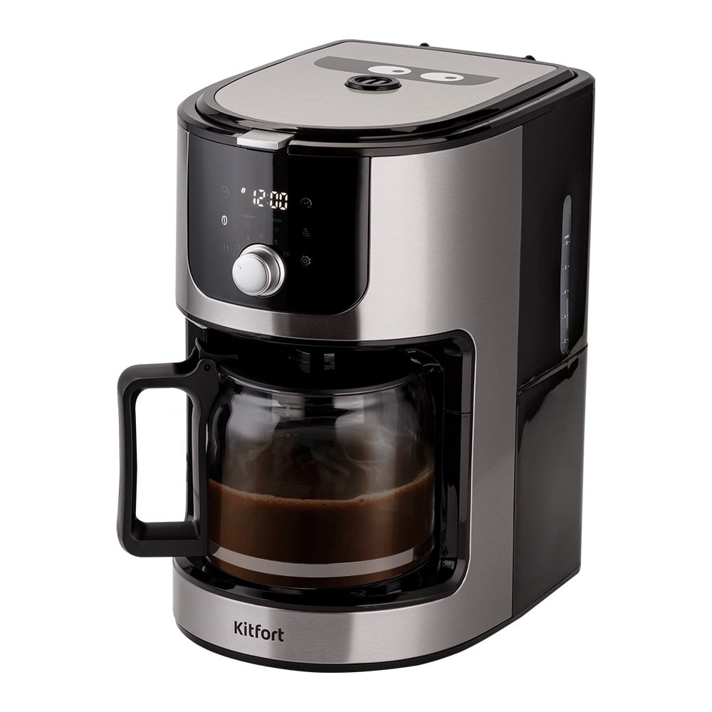 Кофемашина KITFORT КТ-782 предназначена для приготовления кофе в домашних условиях или в офисе. Встроенная кофемолка автоматически измельчит кофейные зерна сразу в фильтре. Кофеварка оснащена многоразовым нейлоновым фильтром, который удобно мыть после приготовления кофе и использовать снова. В комплекте идет мерная ложка. У кофемашины есть LED-дисплей с понятными обозначениями всех программ. Вы можете видеть текущее время на часах на дисплее. Кофемашина оборудована противокапельной системой – затвором, приостанавливающим подачу кофе при вынимании кофейника из кофемашины. Вы можете налить кофе в чашку, не дожидаясь окончания приготовления. По окончании приготовления напитка кофемашина перейдет в режим подогрева. Платформа, на которой стоит кофейник с готовым кофе, будет горячей в течение 30 мин, затем кофемашина выключится. Звуковой сигнал известит вас об окончании работы платформы. Резервуар для воды емкостью 1,2 л позволяет за один раз приготовить кофе на 6 больших (по 200 мл) или 10 маленьких (по 120 мл) чашек. Корпус кофейника прозрачный, поэтому вы всегда можете видеть, сколько кофе еще осталось. Резервуар для воды оснащен мерной шкалой. Автозапуск до 24 часов. Больше не придется вставать на 20 мин раньше, чтобы успеть сделать кофе. Установите время автозапуска, и к моменту, когда прозвенит будильник, вас будет ждать свежезаваренный кофе.