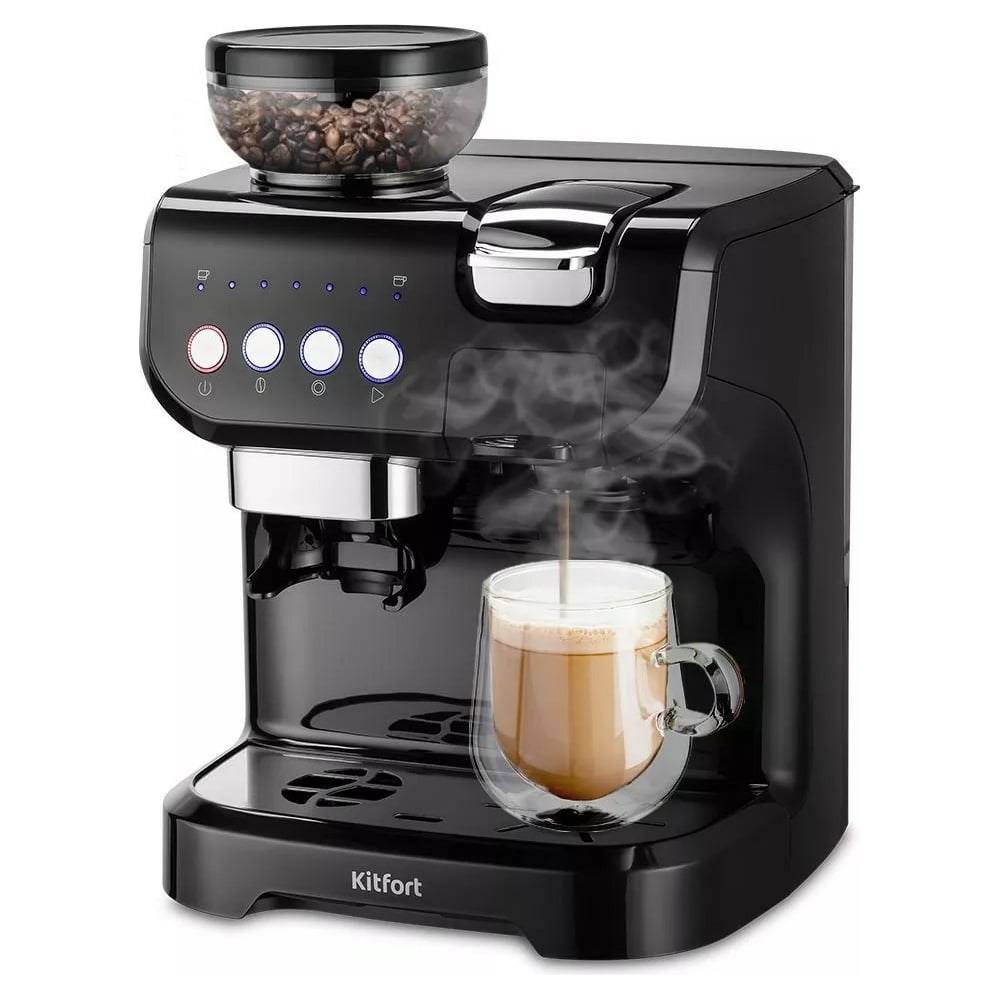 Кофеварка 3 в 1 KITFORT КТ-7107 – многофункциональное устройство, сочетающее в себе функции кофемолки, капсульной и рожковой кофеварки. Кофеварка поможет приготовить кофе эспрессо, американо или лунго, а также множество других видов кофе на ваш вкус. Благодаря 3 адаптерам, которые входят в комплект, кофеварка подходит для капсул типа Nespresso и Dolce Gusto, а также для молотого кофе. Она прекрасно совмещает в себе все преимущества каждого типа кофеварок и готовит под давлением 19 бар. Кнопками на панели управления можно включать и отключать жерновую кофемолку. Кнопка «Объём» циклически переключает объем кофе. Каждая кнопка на панели управления имеет световой индикатор. Регулятор помола позволяет настроить степень помола кофейных зёрен. Кофемолка измельчает кофейные зёрна непосредственно перед приготовлением, что делает кофе более вкусным и ароматным. Контейнер вмещает в себя до 150 грамм зёрен кофе. Резервуар для воды съёмный — его можно легко снять и наполнить водой в любом удобном месте. Крышка резервуара для воды открывается, поэтому можно заливать воду в резервуар, не снимая его. Поддон для сбора капель со съёмной решёткой из нержавеющей стали легко снимается, моется и устанавливается обратно. В комплекте к кофеварке идут 3 адаптера, подставка для чашки, темпер, щётка и игла для чистки, а также насос для подкачки воды, два фильтра, рожок, мерная ложка. Все комплектующие выполнены из надёжных материалов.
