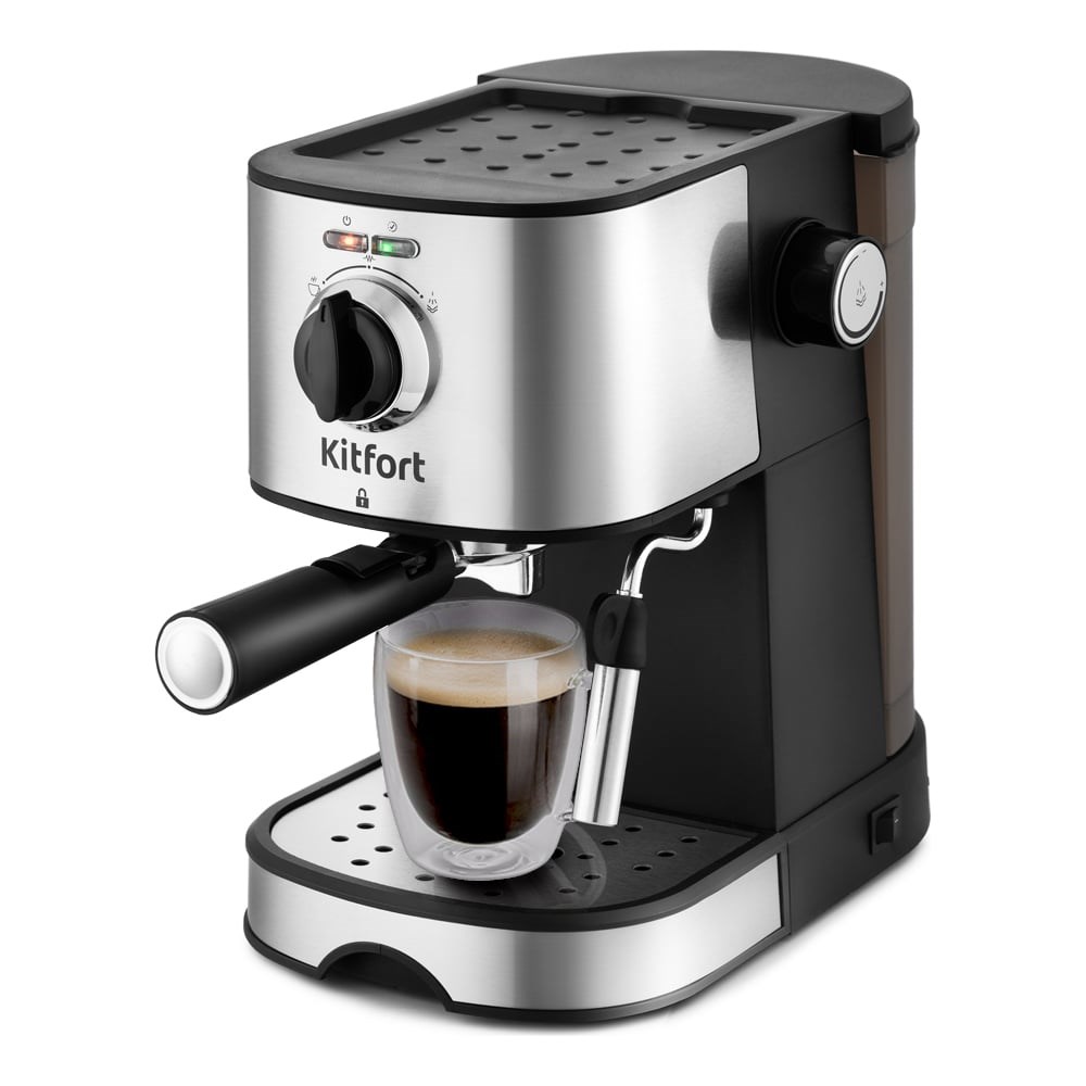 Кофеварка KITFORT КТ-753 приготовит ароматный кофе эспрессо, капучино или латте, а также множество других видов кофе. Приготовление займёт 20-30 секунд. Кофе готовится под давлением, за счёт чего сохраняется оригинальный вкус кофейных зёрен. Капучинатор в кофеварке - это паровая трубка с насадкой панарелло. Трубку погружают в холодное молоко, включают подачу пара и взбивают молочную пенку. Также можно подогреть остывший чай, молоко, взбить какао или горячий шоколад. С помощью ручек управления на корпусе кофеварки можно настраивать уровень подачи пара, а также режим работы: подача воды, нагрев воды или приготовление пара. Индикаторы питания и нагрева располагаются на передней панели прибора. Поддон для сбора капель с решёткой из нержавеющей стали легко снимается, моется и устанавливается обратно. Металлический фильтр с лазерным нанесением отверстий долговечен и не требует использования каких-либо расходующихся частей. Металлический рожок хорошо прогревает напиток, а сам напиток получается насыщенным, густым и с хорошей пенкой. Резервуар для воды ёмкостью 1 л легко снимается, наполняется водой и моется.