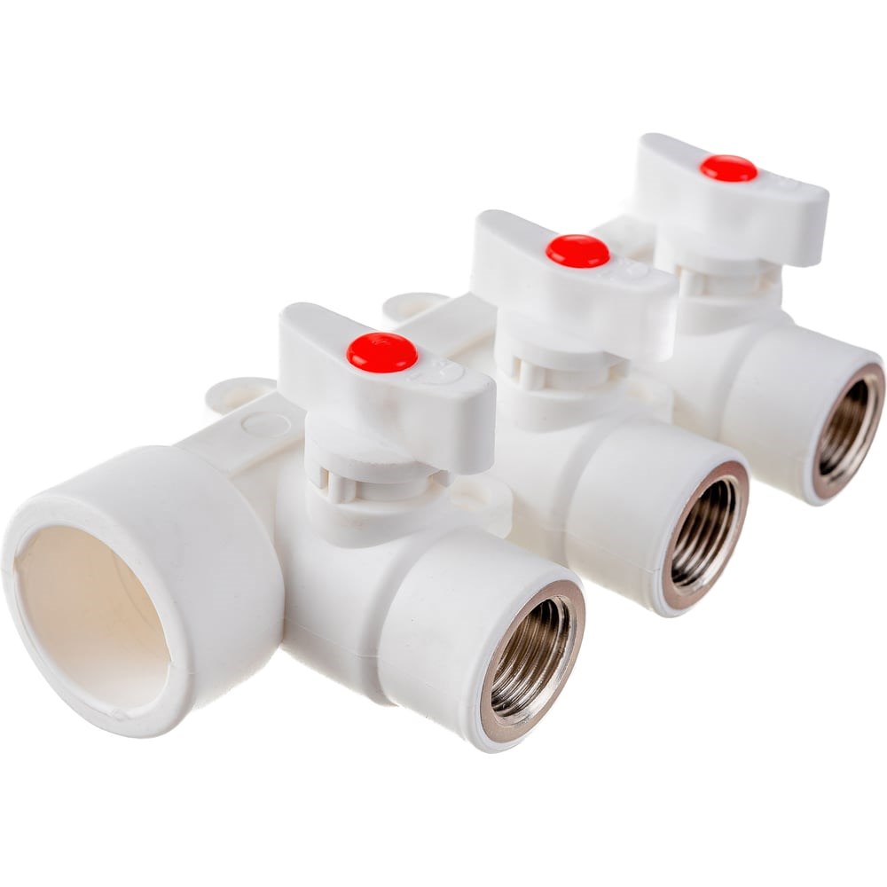 Коллектор с шаровыми кранами LAMMIN PPR ВР 32х1/2х3 Lm31082315032 представляет собой подающую трубу из PPR, на которой установлено три полипропиленовых шаровых крана. Выход кранов имеет внутреннюю латунную резьбу, запирающие элементы кранов (шары) изготовлены из нержавеющей стали. Коллектора для воды выполняют функцию подключения к одному источнику тепла нескольких распределительных трубопроводов. Закладной элемент и шаровый затвор - латунь марки CW617N.