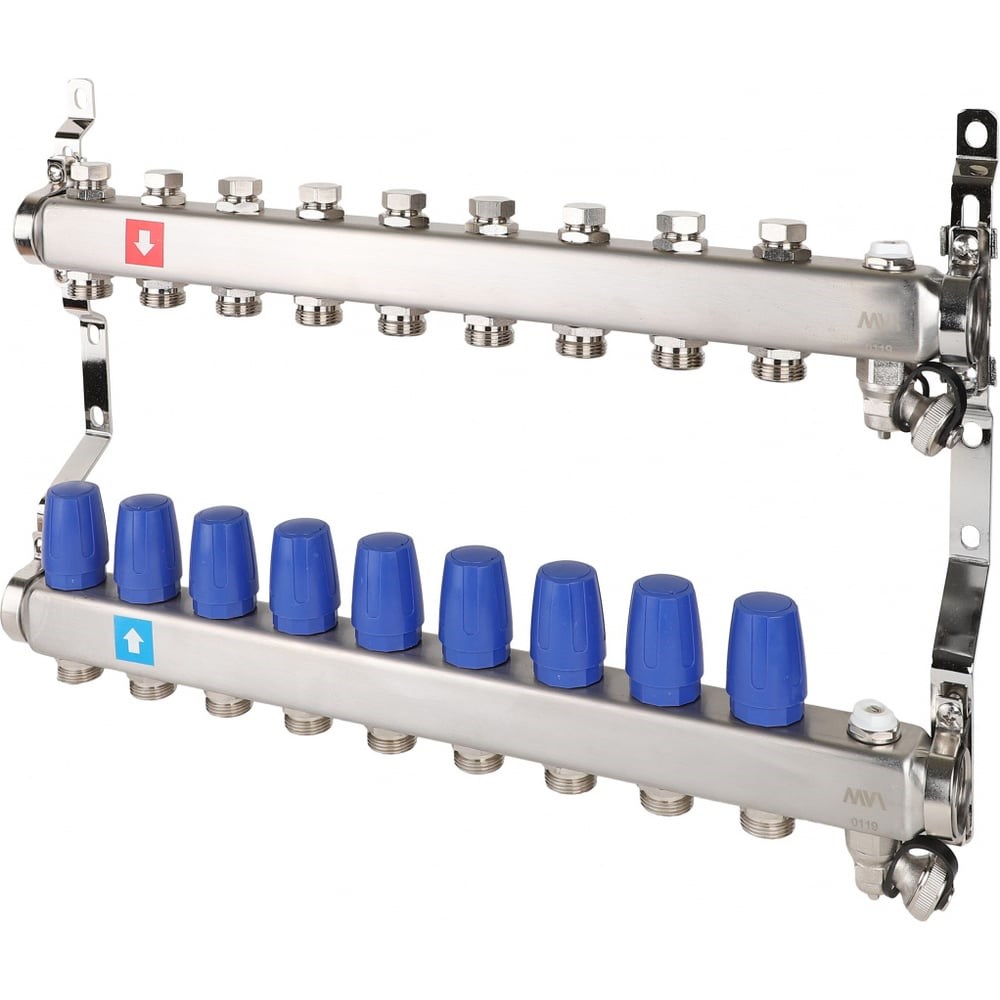 Коллектор MVI из нержавеющей стали, в сборе без расходомеров, с дренажным краном и воздухоотводчиком MS.609.06 предназначен для распределения потока рабочей среды систем водяного отопления по потребителям. При этом под «потребителем» понимается отдельный нагревательный прибор или группа приборов, контур или петля «теплого пола», отдельные части или ветви системы. Коллекторный блок объединяет в себе подающий и обратный коллекторы из нержавеющей стали, запорные клапаны, термостатические клапаны (с возможностью установки электротермического сервопривода) и крепежные кронштейны. Присоединение циркуляционных петель осуществляется с помощью фитингов стандарта «евроконус» 3/4" (НР).