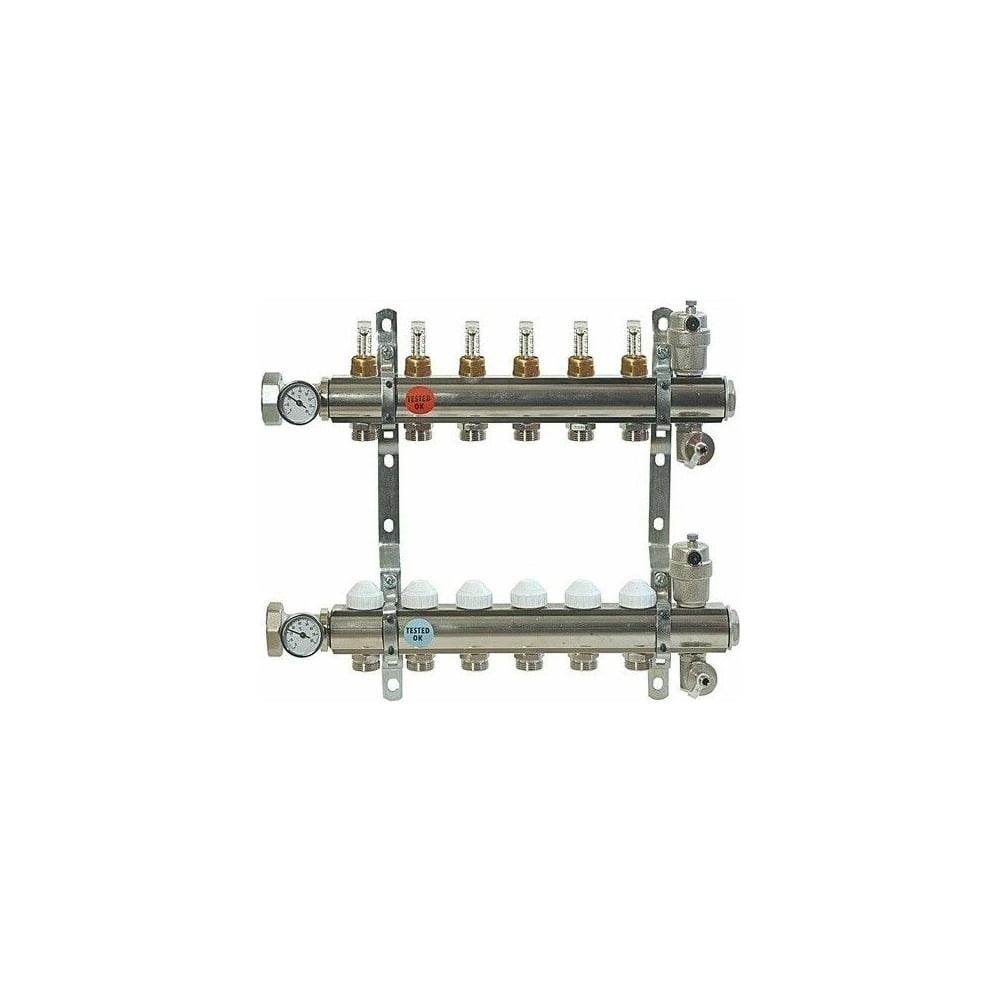 Коллекторная группа Comisa 1- 7 выходов, с расходомерами, межосевое 20 см 8810145 активно применяется при организации систем теплого пола и разводки радиаторного отопления. Устройство служит для распределения теплоносителя по отдельным контурам. Внимание! Изображение товара отличается от реального, ориентируйтесь на технические характеристики.