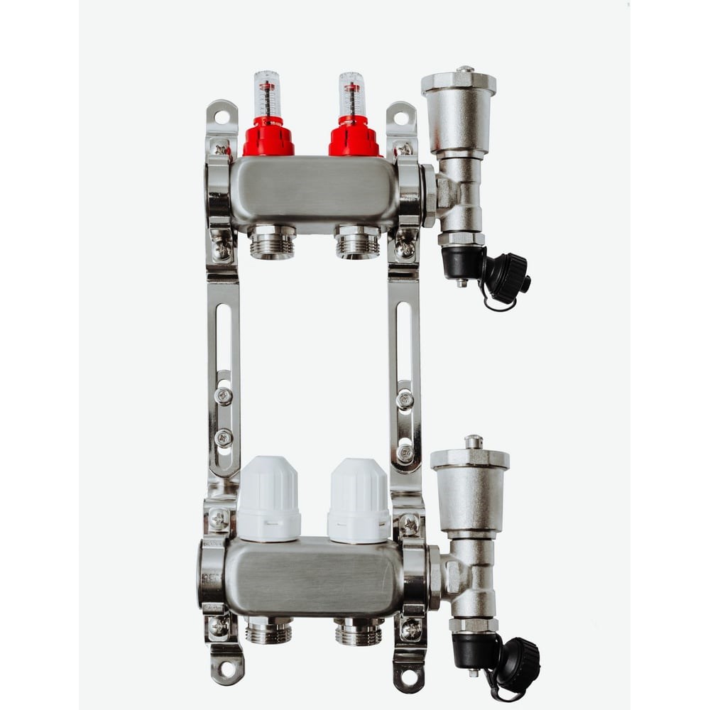 Коллекторная группа с расходомерами Grosetto 1"x3/4" 2 выхода, нержавеющая сталь, 10 бар 2042989 используется в системах отопления. Коллектор распределительный для систем теплого водяного пола используется для контроля и распределения теплоносителя в системе отопления. Каждая труба отопительной системы водяного отопления или теплого пола подключается к коллектору, что позволяет осуществлять контроль и регулировку потока теплоносителя индивидуально в каждом циркуляционном кольце. Распределительный коллектор состоит из подающей и обратной гребенок. Подающая гребенка имеет возможность отключения (перекрытия) каждого отдельного контура системы отопления, оснащается расходомерами. Обратная гребенка оборудуется терморегулирующими клапанами с предварительной настройкой пропускной способности. Терморегулирующие клапаны могут быть автоматизированы с помощью термоэлектрических сервоприводов; для ограничения расхода теплоносителя на каждый отвод используется предварительная настройка пропускной способности. Распределительные коллекторы для теплого пола состоят из двух гребенок.