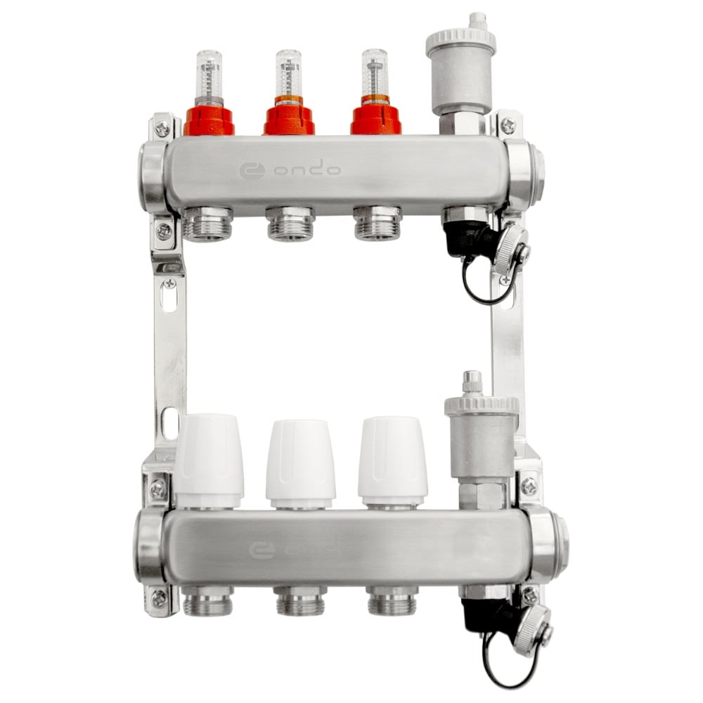 Коллекторная группа ONDO предназначена для оптимизации, контроля и распределения теплоносителя в системах радиаторного и напольного отопления. Коллекторная группа–важный элемент водяного теплого пола. Благодаря ейпроисходит смешивание горячей и холодной жидкости. Такая особенность позволяет произвести регулировку температуры теплого пола и контролировать его работу. Коллекторная группа ONDO может работать на водяном, либо этиленгликолевом теплоносителе с максимальным содержанием гликоля не более 45%. Коллекторная группа поставляется предварительно в собранном виде. Автоматический воздухоотводчик и дренажный кран встроены в корпус. Материал корпуса - нержавеющая сталь. Установочные кронштейны входят в комплект. Насосно-смесительный узел приобретается отдельно. Данная модификация построена на использовании расходомеров и термостатических клапанов Детали коллекторной группы соединены между собой на заводе с помощью уплотнительных колец и герметизированы специальным анаэробным клеем. Это позволяет отказаться от дополнительных герметизирующих и уплотнительных материалов при установке. Изделие соответствует требованиям ГОСТ 12.2.063–2015 • Количество выходов: 3 шт • Диаметр условного прохода при подключении к системе водоснабжения: 1”дюйм • Диаметр подключения отводов для разводки: 3/4”, евроконус • Максимальное рабочее давление: 10 бар • Диапазон температуры теплоносителя: +5..+110˚C • Средний полный срок службы: 25 лет • Условная пропускная способность термостатического клапана: 2,6 Kvs, м3/ч
