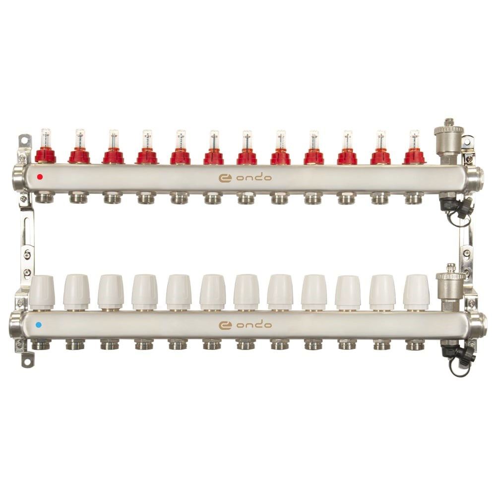 Коллекторная группа ONDO из нержавеющей стали предназначена для оптимизации, контроля и распределения теплоносителя в системах радиаторного и напольного отопления. Коллекторная группа позволяет произвести регулировку температуры теплого пола и контролировать его работу. Коллекторная группа ONDO может работать на водяном, либо этиленгликолевом теплоносителе с максимальным содержанием гликоля не более 45%. Коллекторная группа поставляется предварительно в собранном виде. Автоматический воздухоотводчик и дренажный кран встроены в корпус. Материал корпуса - нержавеющая сталь. Установочные кронштейны входят в комплект. Насосно-смесительный узел приобретается отдельно. Данная модификация построена на использовании расходомеров и термостатических клапанов Детали коллекторной группы соединены между собой на заводе с помощью уплотнительных колец и герметизированы специальным анаэробным клеем. Это позволяет отказаться от дополнительных герметизирующих и уплотнительных материалов при установке. Изделие соответствует требованиям ГОСТ 12.2.063–2015 • Количество выходов: 12 шт. • Диаметр условного прохода при подключении к системе водоснабжения: 1”дюйм • Диаметр подключения отводов для разводки: 3/4”, евроконус • Максимальное рабочее давление: 10 бар • Диапазон температуры теплоносителя: +5..+110˚C • Средний полный срок службы: 25 лет • Условная пропускная способность термостатического клапана: 2,6 Kvs, м3/ч