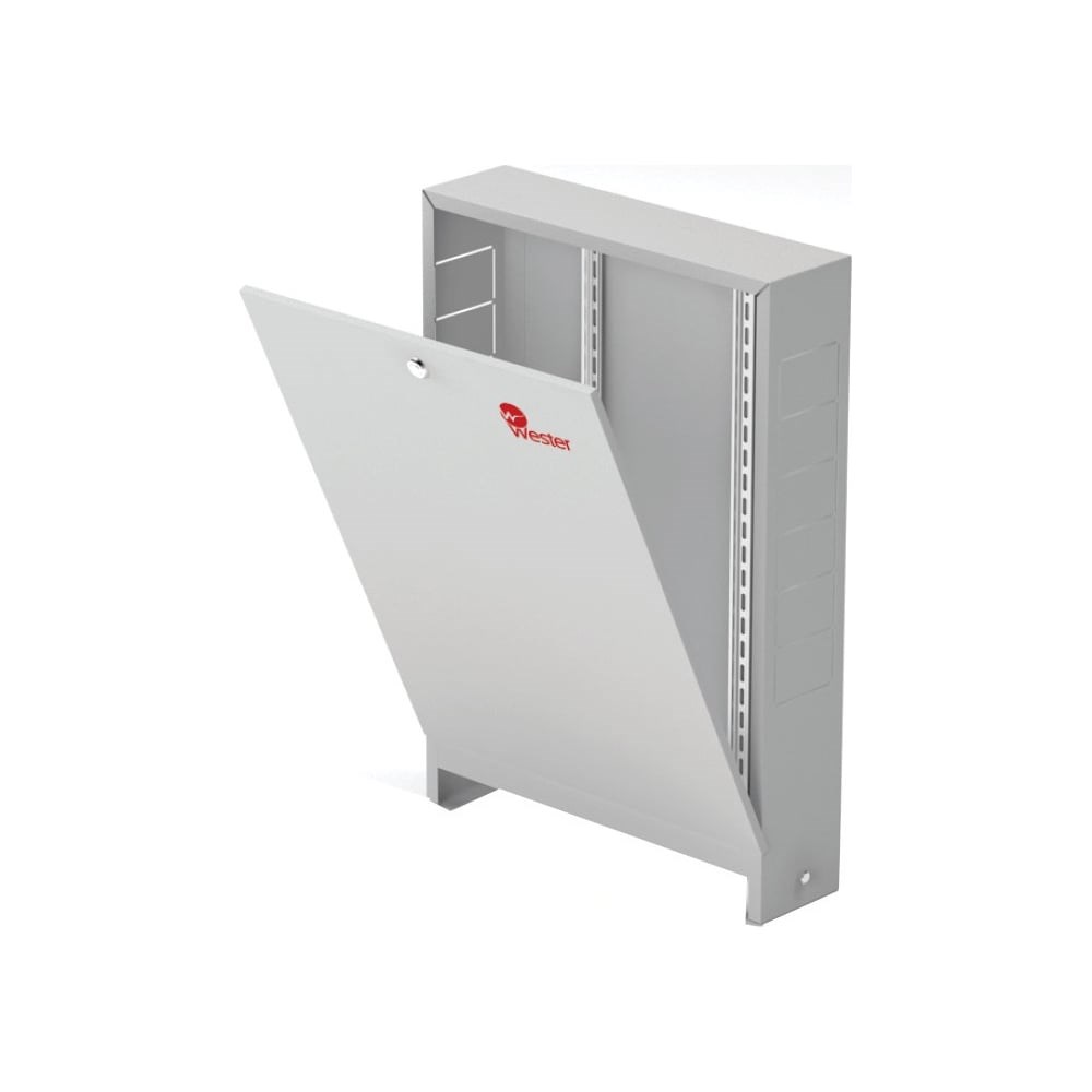 Коллекторный шкаф Wester ШРН-2 предназначен для монтажа в нем распределительных коллекторов для систем отопления, водоснабжения, насосно-смесительных узлов, малых тепловых пунктов и станций поквартирного учёта тепла и расхода воды. Шкаф распределительный, серия ШРН предназначен для наружного монтажа.. Лицевые поверхности окрашены порошковой эмалью по фосфатной подготовке. Внутри шкафа установлены передвижные монтажные рейки, к которым крепится оборудование.