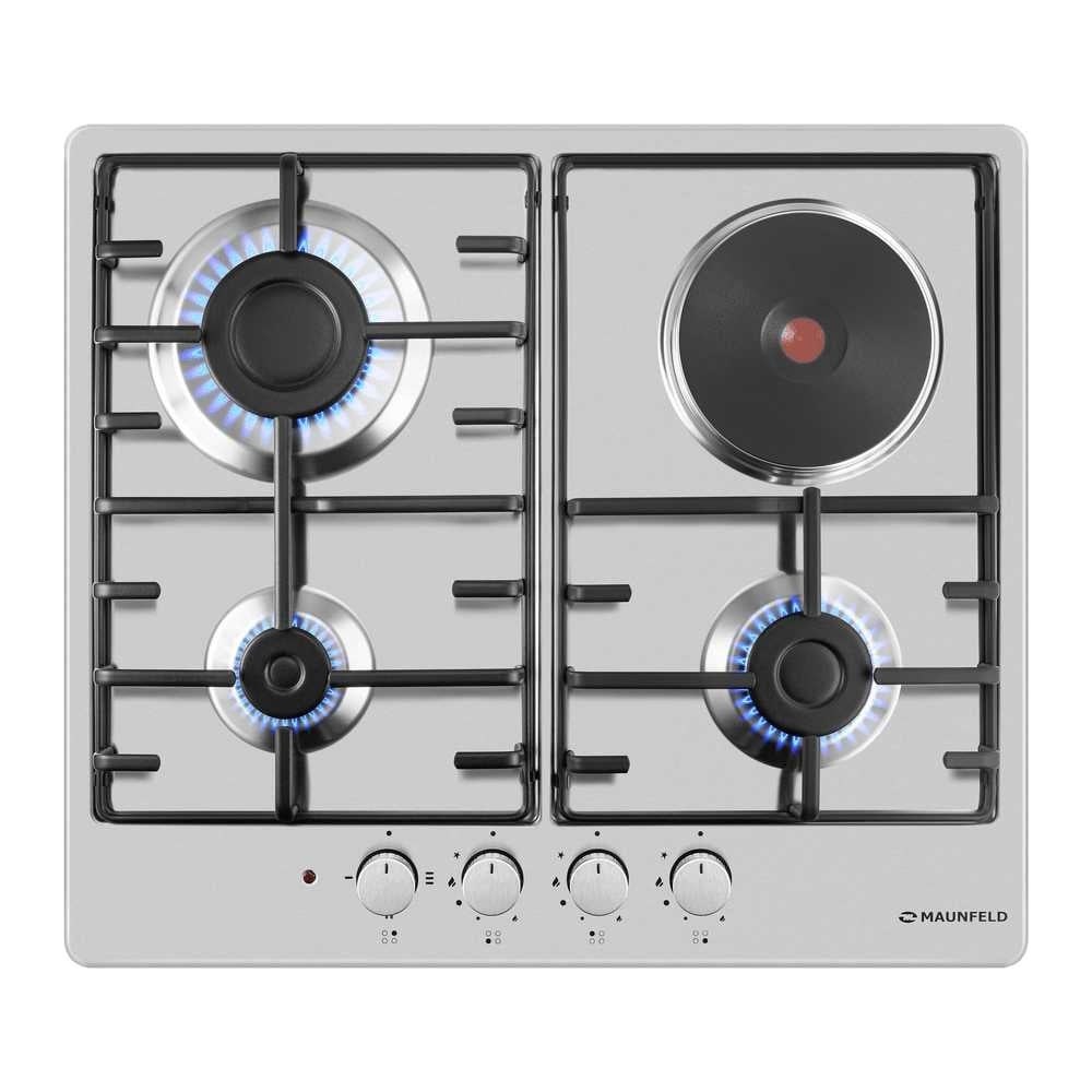 Универсальная встраиваемая комбинированная варочная панель шириной 60 см - идеальное сочетание двух типов плит - газовой и электрической. Выполнена из нержавеющей стали, устойчивой к царапинам и регулярным перепадам температур. Может работать как от магистрального газа, так и от газа в баллоне (тип G30), для этого достаточно поставить специальные жиклеры французской фирмы SOURDILLON, имеющиеся в комплекте. Три газовые конфорки, установленные в данной модели - это высококачественные итальянские горелки SABAF мощностью 2600 Вт, 1700 Вт и 1000 Вт. Одна электрическая конфорка - это чугунная HP RAPID конфорка быстрого нагрева со стальной окантовкой диаметром 180 мм и мощностью 1500 Вт. Красный круг по центру конфорки – индикатор нагрева. Матовые эмалированные решетки ZENIYA выглядят современно и эстетично, отличаются своей долговечностью за счет специального напыления. Включение электроконфорки, подача газа и электроподжиг производится с помощью поворотных полнотелых цельнометаллических ручек. Около каждой ручки есть пиктограммы: используемая конфорка, конфорка выключена, электроподжиг, максимальная мощность и минимальная мощность. Система газ-контроля надежно защищает бытовой прибор от утечек газа при неожиданном затухании конфорки. При готовке на этой плите вы можете использовать посуду любого типа.