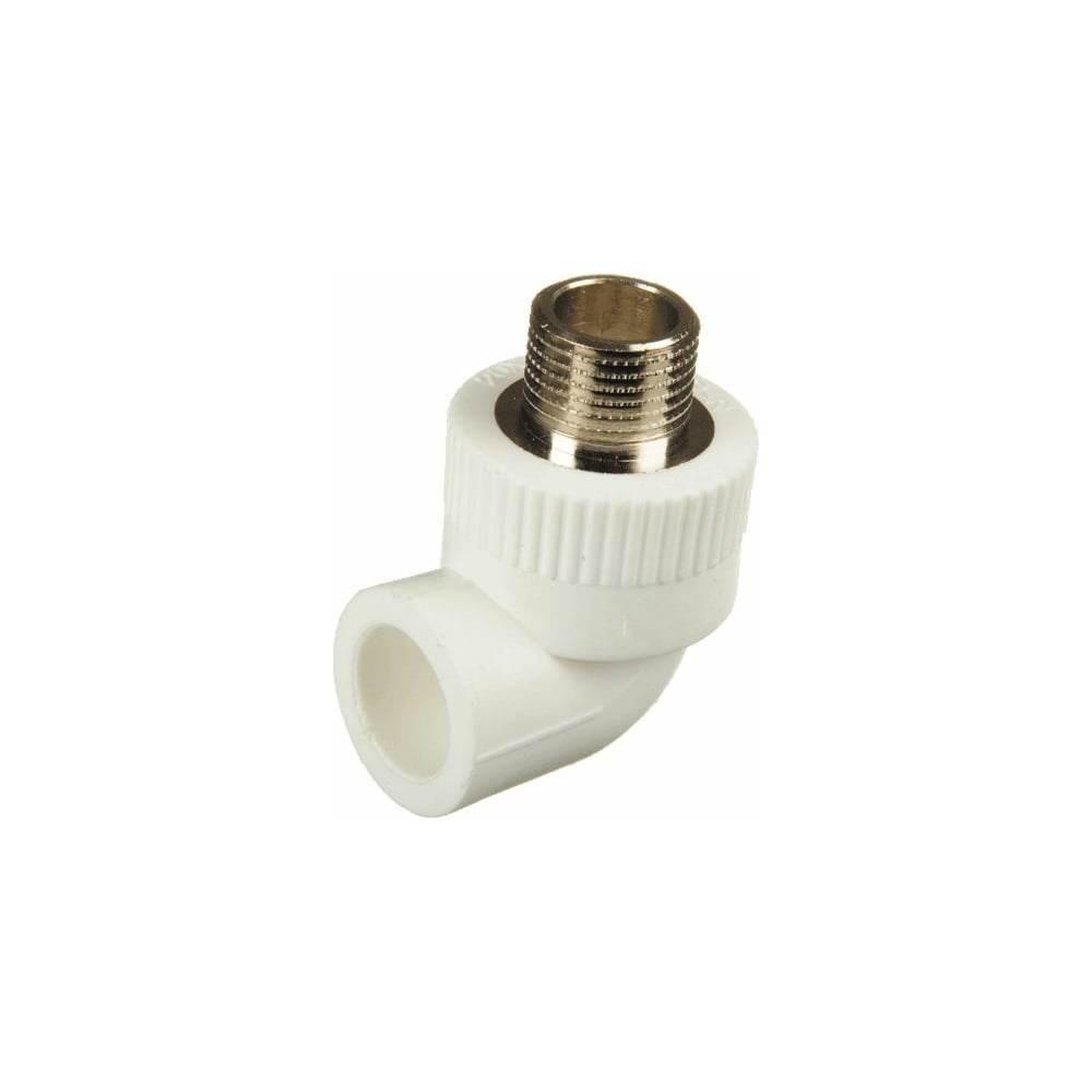 Уголок полипропиленовый 90 градусов комбинированный 25х3/4" наружная резьба КРОСС (НР/ш) является соединительным элементом в полипропиленовых системах водоснабжения и отопления. Позволяет изменить направление трубопровода на 90 градусов и перейти на резьбовые элементы системы.