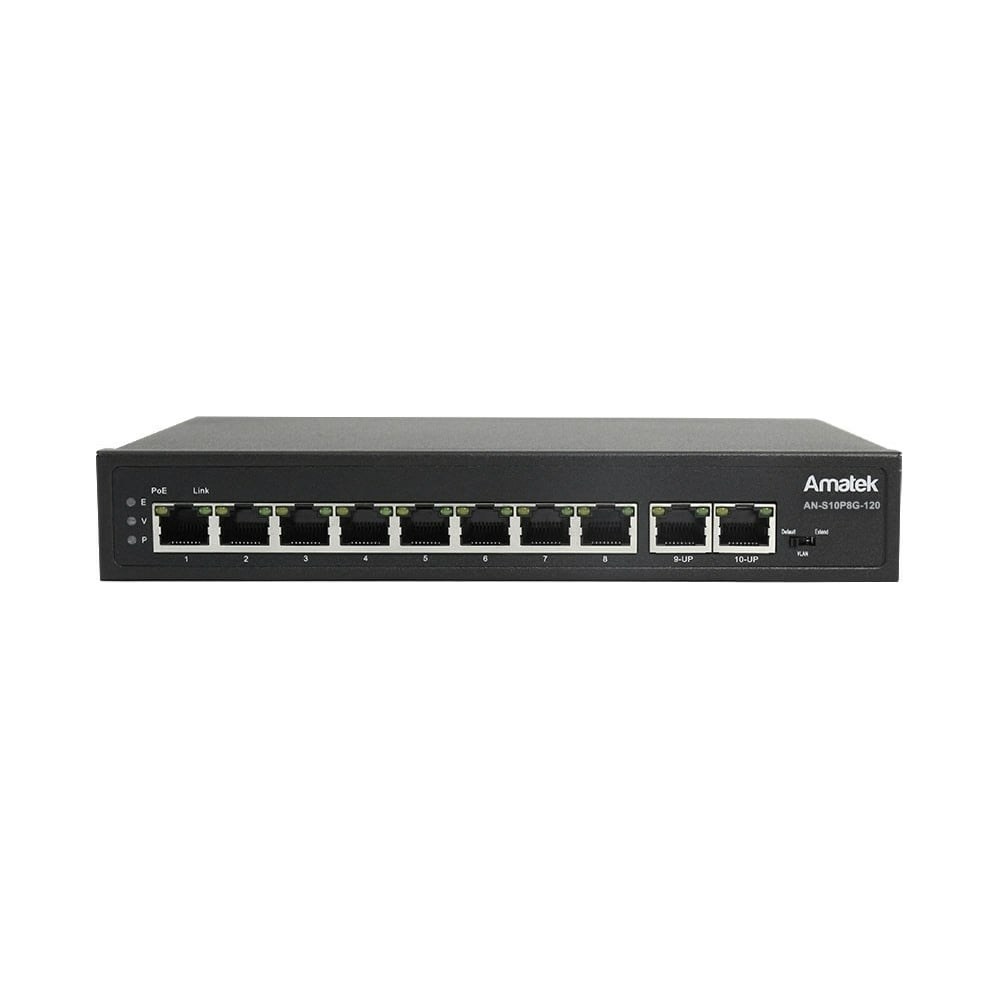 Коммутатор Amatek AN-S10P8GA на 10 портов 7000617 имеет 8 портов 10/100 Мбит/с с поддержкой PoE+ 30Вт (IEEE 802.3 at/af), автосогласованием и авто-MDI/MDIX (RJ45) и 2 порта 10/100/1000 Мбит/с с автосогласованием и авто-MDI/MDIX (разъёмы RJ45). Питание от сети AC 110-240В. Power over Ethernet (PoE): 8 портов PoE+, позволяющие передавать питание и данные по одному кабелю. Поддержка потребляемой мощности до 30 Вт для каждого PoE-порта. Перераспределение мощности между портами в зависимости от потребления нагрузки. Общая потребляемая мощность 120 Вт для всех PoE-портов. Совместим с PoE-устройствами на базе стандартов IEEE 802.3 at/af. Коммутация: Поддержка аппаратного VLAN обеспечивает разграничение доступа к данным, защиту от сетевых штормов и способствует предотвращению вирусных атак. Поддержка стандарта управления потоком IEEE 802.3x Flow control для полнодуплексного режима предотвращает потерю данных в буфере и приводит к улучшению общей производительности сети. Коммутационная способность 7,6 Гбит/с . Для работы на расстоянии до 250 м необходимо использовать LAN кабель CAT5e и выше, UTP4 24AWG (медные провода сечением не менее 0,5мм).