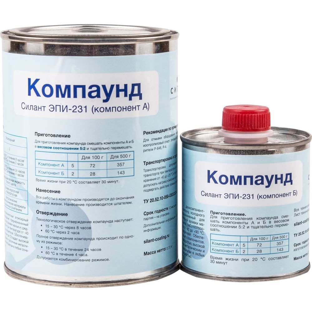 Силант ЭПИ-231 – двухкомпонентный жёсткий эпоксидный заливочный компаунд холодного отверждения, предназначенный для заливки малых и средних объёмов и формирования композитов; работоспособен при температуре от -40 до +90°С длительно и 110 °С кратковременно. Допускается ускоренное отверждение при повышенных температурах. Не содержит растворителей. Обеспечивает высокую прочность, стойкость к ударам, вибрации. Обладает высокой адгезией к различным металлическим и неметаллическим материалам. Стоек к разливам ГСМ, технических жидкостей, длительному контакту с водой (морской и пресной), растворами солей.
