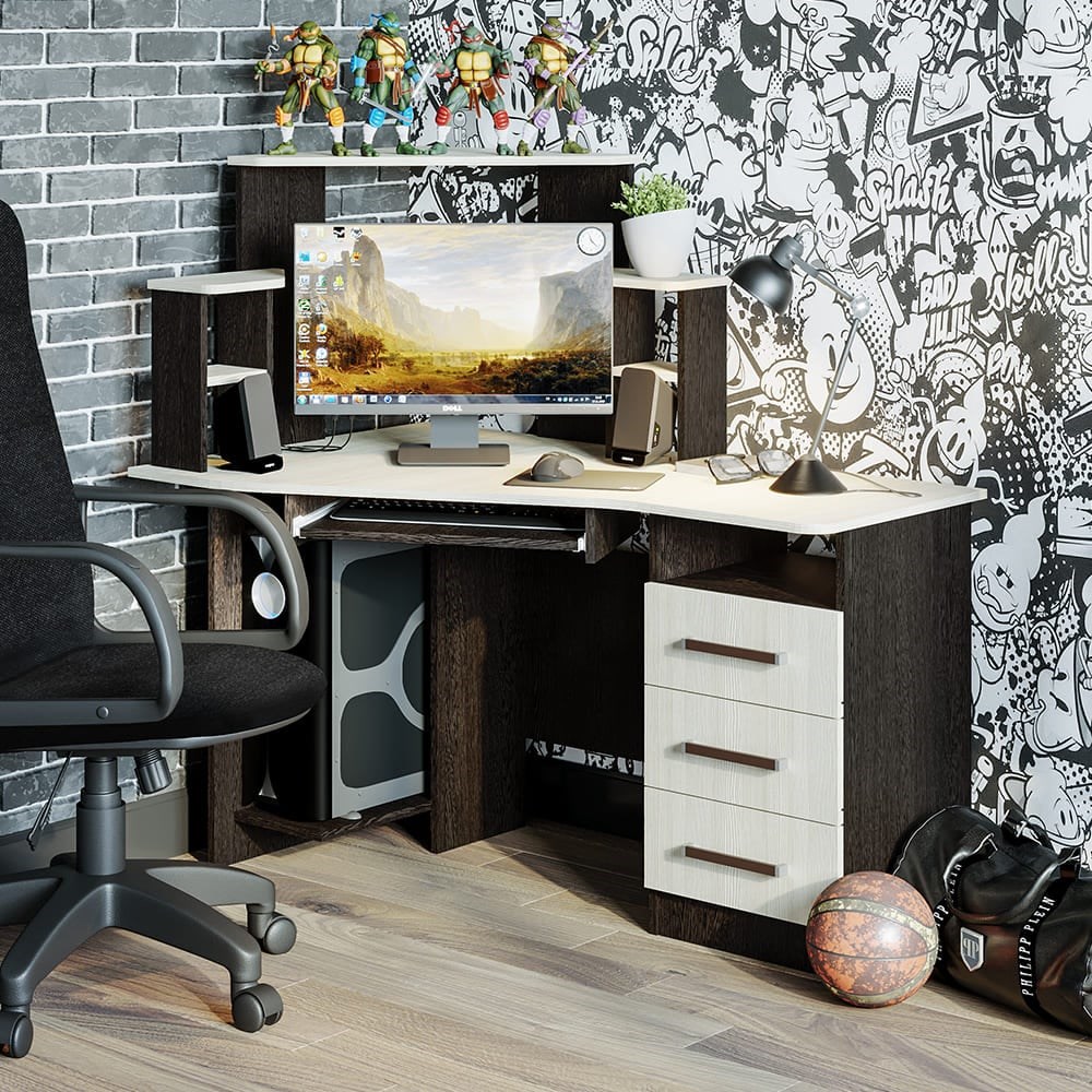 Удобный угловой компьютерный стол впишется в любой интерьер квартиры и офиса. Модель оснащена тремя выдвижными ящиками на роликовых направляющих и удобными открытыми полками для хранения различных мелочей. Также имеется полка под принтер и место под системный блок. А самое главное, что Каспер можно использовать в качестве письменного стола, ведь ширина его столешницы - 130 см. Особенности контрастный декор с текстурой дерева венге/лоредо максимальный размер монитора - 21 дюйм сборка не универсальная разнообразное наполнение роликовые направляющие на ящиках выдвижная полка под клавиатуру