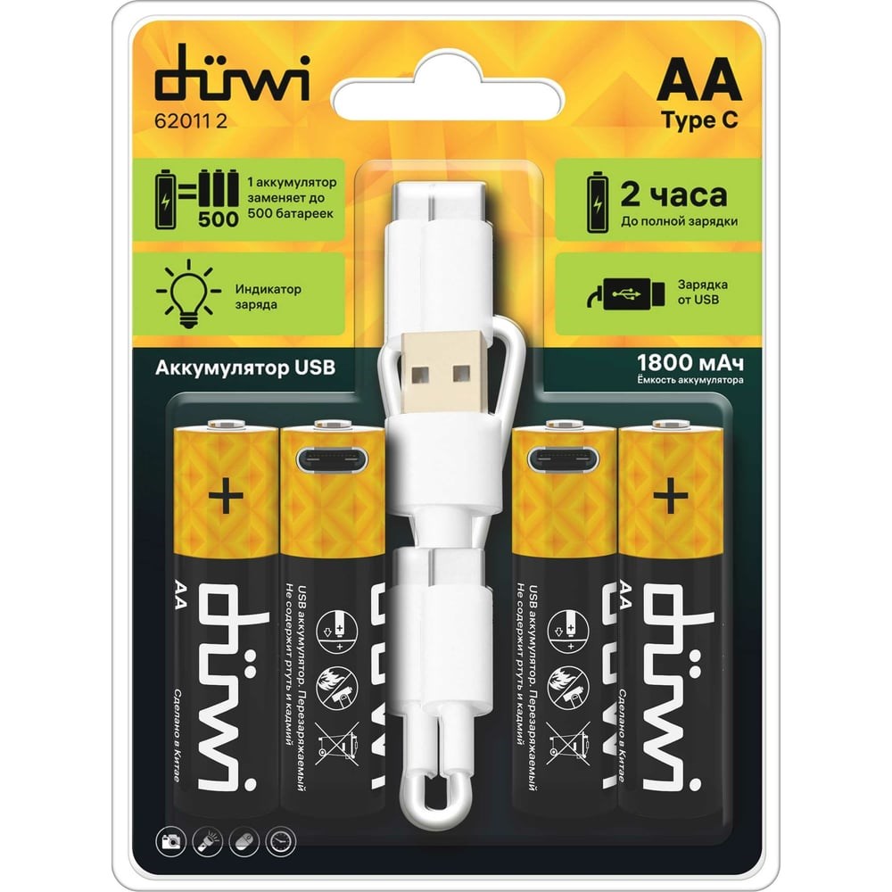 Дополнительные технические характеристики комплектов аккумуляторов duwi AA 4PACK Li-Ion 1.5V 62011 2: Подходит для использования в различных устройствах, таких как пульты, фонарики, компьютерные мыши, клавиатуры и т.п. Благодаря USB Type-C кабелю из комплекта, аккумуляторы возможно зарядить от любого устройства, имеющего стандартный разъем USB 2.0 (и выше). Встроенный индикатор обозначит процесс зарядки, а также ее окончание. В аккумулятор встроена защита от низкого уровня заряда, что приводит к потере общей ёмкости устройства, так и от перезарядки (отключение питания при 100%). Длина провода, м - 0,125. Срок службы - до 500 циклов зарядки.