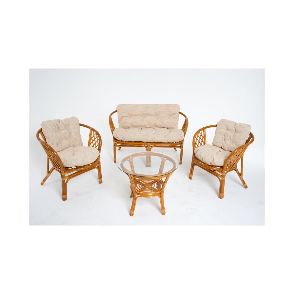 Комплект для отдыха Vinotti Багамы 01/16 NEW Коньяк подушки рогожка – интересное предложение с оригинальным дизайном с изящным плетением ручной работы. Плетеная мебель – изысканное дополнение интерьера в частном доме, ресторане или отеле. Она комфортна, стильно выглядит, подходит для дома и улицы, служит не менее двух десятилетий. В комплектацию входят мягкие подушки на сиденье и спинку для кресел и дивана, ткань хлопок. Стекло толщиной 5 мм крепится на силиконовые присоски.