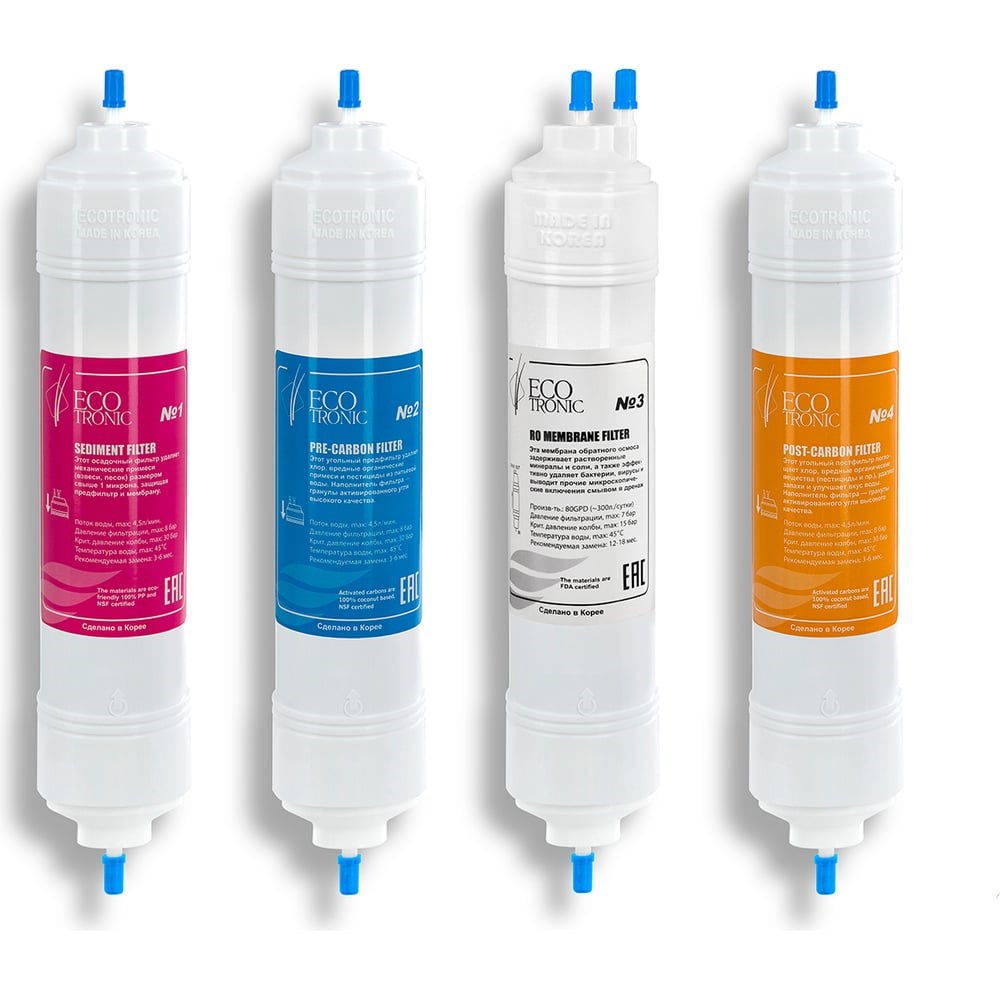 Комплект фильтров с RO мембраной (14 дюймов) 7252 ECOTRONIC ETK7252 для настольных и напольных пурифайеров с обратно-осмотической мембраной (RO). Фильтр №1 Sediment filter. Осадочный фильтр удаляет механические примеси (взвеси, песок) размером свыше 1 микрона, защищая предфильтр и мембрану 14 дюймов I-тип. Фильтр №2 Pre-carbon filter. Угольный предфильтр удаляет хлор, вредные органические примеси и пестициды из питьевой воды. Наполнитель - гранулы активированного угля 14 дюймов I-тип. Фильтр №3 Ro membrane filter. Это мембрана обратного осмоса задерживает растворимые минералы и соли, а также эффективно удаляет бактерии, вирусы и выводит прочие микроскопические включения смывов и дренаж 14 дюймов I-тип. Фильтр №4 Post-carbon filter. Угольный постфильтр поглощает хлор, вредные органические вещества (пестициды и др.), удаляет запахи и улучшает вкус воды. Наполнитель - гранулы активированного угля 14 дюймов I-тип. Производитель рекомендует производить замену фильтров: не реже 1 раза в 6 месяцев. Подобные пурифайеры маркируются после дефиса xx-R4L или xx-R4T, где xx - серия и номер модели, R - мембрана обратного осмоса, 4- ступеней очистки, L или Т - напольный или настольный. Ресурс каждого картриджа до 12500. литров. Мембрану обратного осмоса можно менять 1 раз в год, ресурс до 6 тыс. литров, в зависимости от минерализации воды. При большом потреблении (в больших офисах, фитнесах и т.п.) фильтры могут меняться чаще - 1 раз в 3 или 2 месяца.