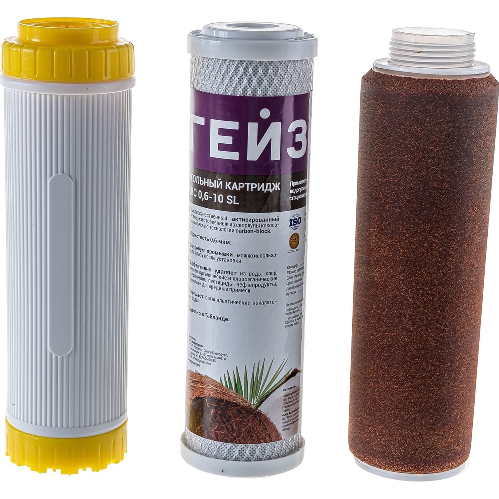 Комплект картриджей №5 Гейзер 50009 состоит из трех сменных картриджей и переходной муфты для комплексной очистки сверхжесткой воды. Устанавливаются в трехступенчатый бытовой фильтр Гейзер 3 ИВС Люкс (высокий уровень минерализации). Так же совместим с любыми трёхступенчатыми фильтрами под мойку типоразмером 10 SL.В набор входят:картридж Арагон 2, обеспечивает защиту от вредных примесей марганца, железа, солей жесткости;картридж БС, для смягчения воды;картридж СВС, завершает очистку, освобождая воду от хлора, патогенных микроорганизмов, улучшает вкус и запах;переходная муфта.
