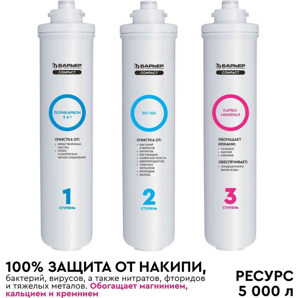 Комплект картриджей Барьер "COMPACT OSMO 100М" Р272Р03 устанавливается в качестве 1-3 ступеней в фильтре COMPACT OSMO 100М. Замена картриджей не требует специальных инструментов. "БАРЬЕР Compact Поликарбон" - запатентованная технология, максимально эффективная очистка от хлора, органических соединений, ионов тяжелых металлов и неприятных запахов и привкусов. Ресурс: 5000л. Рекомендуемая частота замены – 6 мес. "БАРЬЕР Compact RO 100" - 100 галлонная обратноосмотическая мембрана пропускает только молекулы воды, задерживая все возможные примеси. Ресурс: 5 000л. Рекомендуемая частота замены – 18 мес. "БАРЬЕР Compact Карбоминерал» - возвращает воду к физиологически полноценному состоянию после очистки обратным осмосом (обессоливанием). Обогащает воду полезными минералами для здоровья: Магний – поддерживает иммунитет, уменьшает уровень стресса, улучшает сон, помогает в работе легких и сердца. Кальций – способствует формированию костей, регулирует сердечный ритм и артериальное давление, поддерживает обменные процессы в организме. Кремний – предупреждает появление сосудистых заболеваний, оказывает иммуностимулирующее действие, снижает риск развития Альцгеймена, предотвращает диабет 2-го типа, отвечает за формирование костей, ускоряет восстановление физической активности. Ресурс комплекта фильтроэлементов - 1000л. Рекомендуемая частота замены – 6 мес. Ресурс фильтроэлементов зависит от качества исходной воды!
