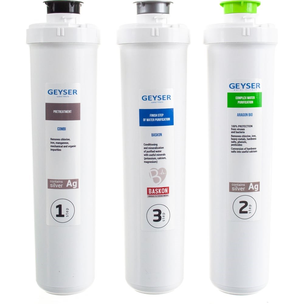 Комплект картриджей для Смарт Био 511 Гейзер 50103 устанавливается втрёхступенчатыйфильтрГейзер Смарт Био 511 для мягкой воды. Ресурс картриджей составляет 12 месяцев.При фильтрации вода проходит следующие ступени очистки:Картридж Комби Смарт необходим для предварительной очистки воды. Состав включает Арагон, кокосовый активированный уголь и серебро.Арагон Смарт БИО очищает водуот тяжелых металлов, хлора и других вредных примесей. В результате улучшается вкус и цвет воды. Кроме того, на данном этапе из воды удаляются бактерии и вирусы до 100%. Серебро не дает бактериям размножаться.Баскон Смарт на финишном этапе обогащает воду калием, магнием, кальцием, снижаетRedOx потенциал и количество свободных радикалов.СРЕДНИЙ РЕСУРС КАРТРИДЖЕЙ*Комби Смарт до 12 мес.Арагон Смарт БИО до 12 мес.Баскон Смарт до 12 мес.* в зависимости от объема потребляемой воды и исходной жесткости.
