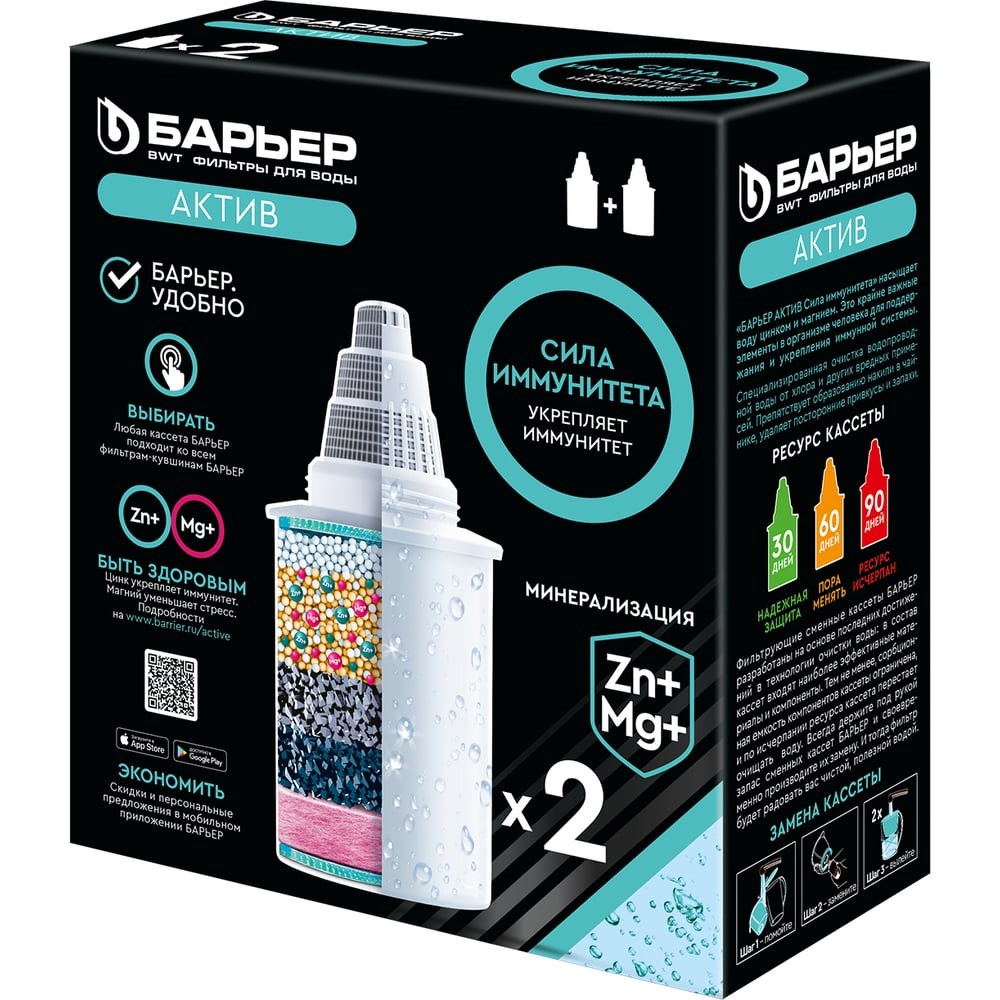 Комплект кассет для кувшинов БАРЬЕР Актив Сила Иммунитета, 2 шт, обогащает магнием и цинком, К492Р00 - базовая очистка и обогащение воды магнием и цинком - важными "строительными элементами" иммунной системы. Улучшенная формула обогащения цинком по сравнению с другими кассетами БАРЬЕР. Цинк повышает защитные функции организма, магний помогает справиться со стрессом. Кассета удаляет хлор, тяжелые металлы и другие вредные примеси. Уменьшает образование накипи. Резьбовое соединение надежно фиксирует кассету и не дает попасть нефильтрованной воде в чистую. Ресурс зависит от качества исходной воды, но составляет не более 350 литров. Все кассеты БАРЬЕР подходят ко всем кувшинам БАРЬЕР. В упаковке 2 кассеты. Одна кассета БАРЬЕР способна заменить несколько сотен пластиковых бутылок. По окончанию ресурса кассеты можно сдать на переработку.