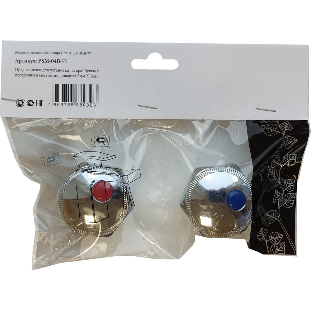 Комплект из двух маховиков для смесителя Профсан ПСМ под квадрат PSM-04B-77 для двухрычажных смесителей. Маховики изготовлены из металла, хромированные, рассчитаны для кран-букс с квадратным штоком размером 7х7мм