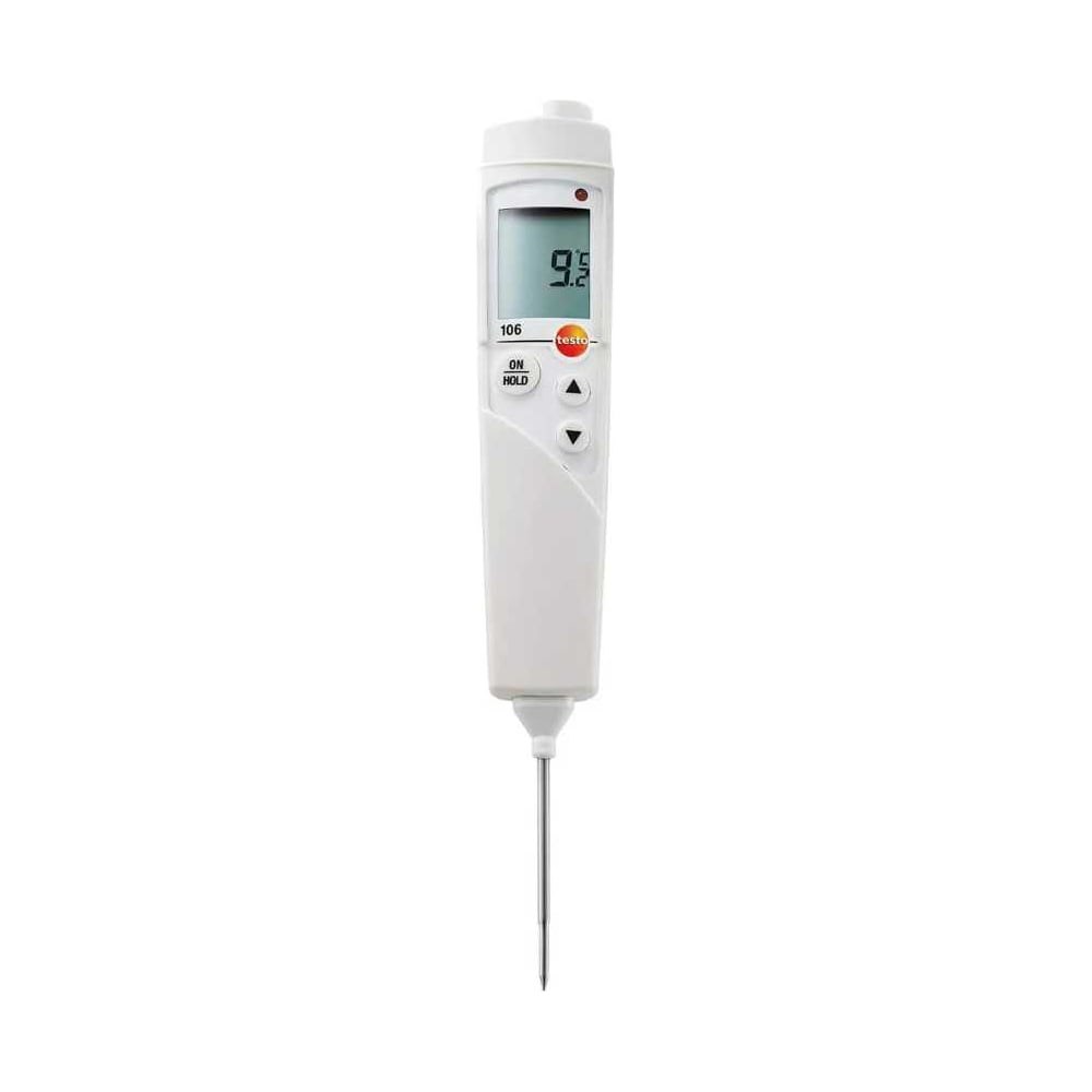 Термометр для измерения внутренней температуры продуктов testo 106 с поверкой (арт. 0563 1063) - особо быстрый и прочный. Его компактный размер и удобная форма позволяют всегда держать прибор под рукой. Благодаря очень тонкому и прочному измерительному наконечнику, прибор оптимально подходит для быстрого измерения внутренней температуры пищевых продуктов в гастрономии, столовых, ресторанах, супермаркетах и т.п. При необходимости в приборе можно задать верхнее и нижнее предельные значения; при превышении данных значений будут подаваться звуковой и визуальный сигналы. Информация о поверке прибора в электронном виде зафиксирована на сайте ФГИС Аршин и проверяется по серийному номеру прибора. В бумажном виде свидетельство о поверке не предоставляется.