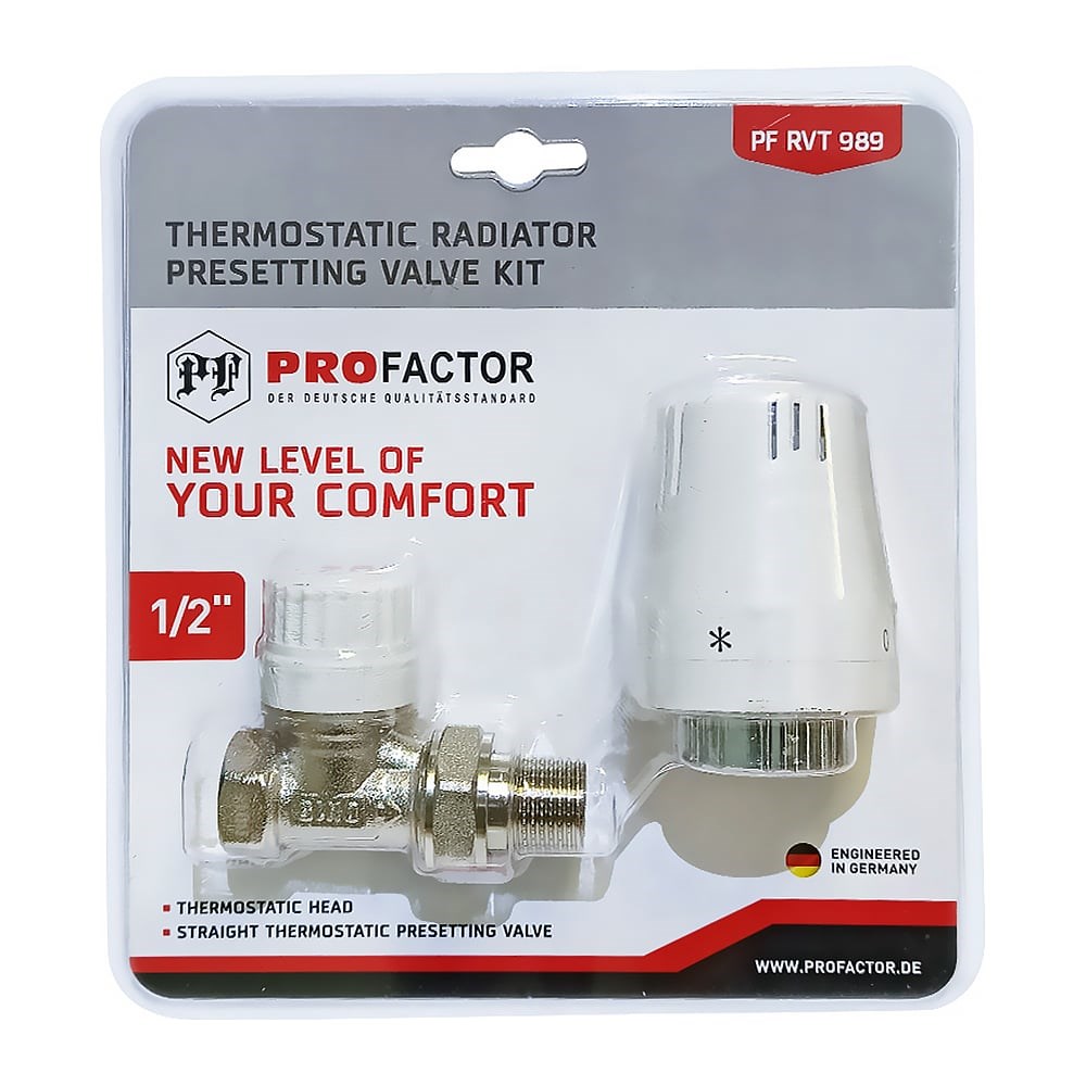 Комплект радиатора PROFACTOR термостатический, прямой, с преднастройкой, 1/2 PF RVT 989 предназначен для подключения отопительных приборов и плавного регулирования теплового режима в помещении за счет изменения расхода теплоносителя в отопительных системах, может использоваться в однотрубных и двухтрубных системах отопления. Применение термостатический комплекта позволяет уменьшить потребление тепловой энергии.