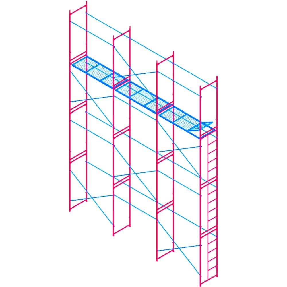 Комплект рамных лесов МЕГА М 8х6 782 используется во время строительных, отделочных и ремонтных работ снаружи помещений. Опорные пяты устанавливаются на деревянную ровную площадку. Крепление лесов к стене осуществляется с помощью регулируемых анкерных кронштейнов и монтажных отверстий. Рамы соединяются между собой до нужной высоты и ширины диагоналями в шахматном порядке со стороны стены и улицы. Металлические настилы с перфорацией исключают скольжение по поверхности в дождливую или заснеженную погоду. Рамы с лестницей предназначены для подъема и располагаются друг над другом для максимального удобства. На рабочем и предохранительном ярусах размещаются продольные связи ограждений.
