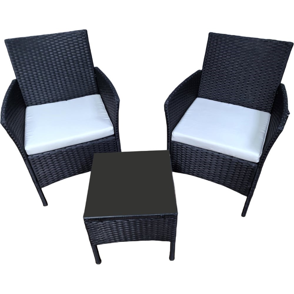 Размер кресел: 58х58х82 см Размер журнального столика: 40х40х38 см Материал мебели: полипропилен, имитирующий плетение под ротанг 9х1,1 мм Каркас: оцинкованная труба с порошковым покрытием Размер трубы: сиденье/подлокотник: 18х18х0,7 мм, спинка/подлокотник: 12х18х0,6 мм, подлокотник: 15х15х0,6 мм; журнальный столик: 15х15х0,6 мм Внутренний материал подушек: 5 см, хлопок 800 г/м2 Ткань подушек: полиэстер 160 г/м2, водонепроницаемый Материал столешницы: закаленное стекло толщиной 5 мм Максимальная нагрузка кресла: 120 кг Максимальная нагрузка стола: 25 кг Цвет мебели: антрацит Цвет подушек: белый Цвет стекла: чёрный